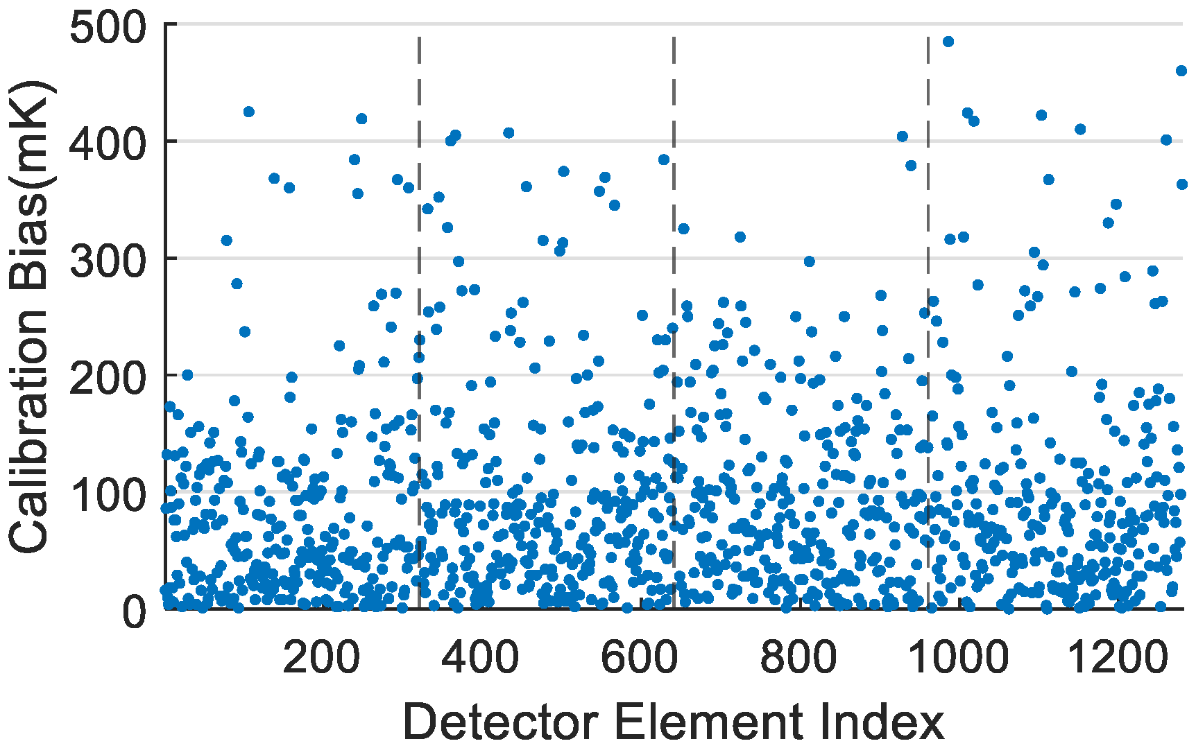 Calibration bias reflects the accuracy of the calibration or the goodness-of-fit of the calibration model. It is generally quantified as the discrepancy between the true radiance (or brightness temperature) and the radiance retrieved through the calibration process under a specific test condition (e.g., the difference between the true brightness temperature and the calibrated brightness temperature based on using a 300 K blackbody as reference). A smaller calibration bias indicates higher calibration accuracy for that specific condition. During the ground testing phase, where the true radiance is known, calibration accuracy can be assessed using the mean or root mean square of the calibration bias across multiple test conditions. However, for on-orbit calibration, obtaining true radiance values across different levels is challenging (due to difficulties in acquiring ground truth for terrestrial targets and the limited active temperature adjustment range of most onboard blackbody systems). Consequently, evaluating on-orbit calibration accuracy using the onboard blackbody often relies on the calibration bias from a single operating condition (the fixed operating temperature of the onboard blackbody) [