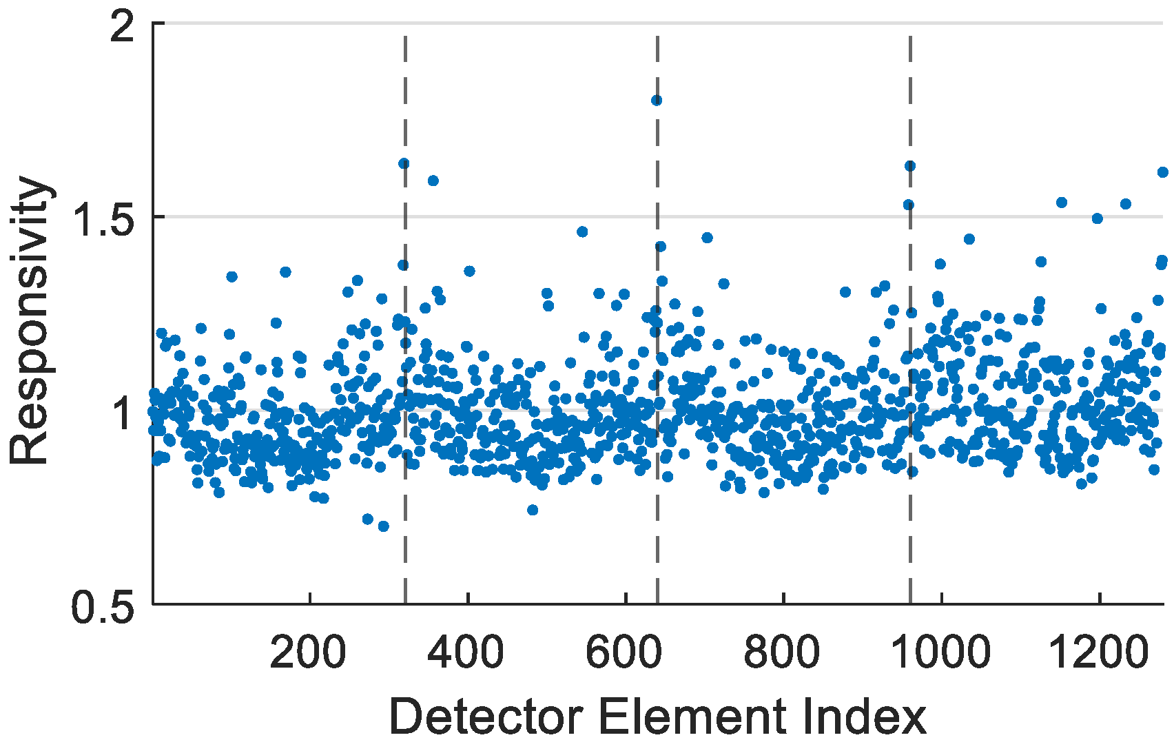 Responsivity refers to the ratio of the change in the detector’s output signal to the change in the incident target energy. Generally, it is desirable for the responsivity of different detectors to be as similar as possible. This facilitates the selection of appropriate bias settings and amplification gains for the subsequent readout circuitry, enabling the full performance potential of the detector. Furthermore, closely matched responsivity values imply that most detectors operate within the central portion of their dynamic range, thereby avoiding the larger calibration biases associated with strong non-linear effects typically found at the extremes of the dynamic range [
