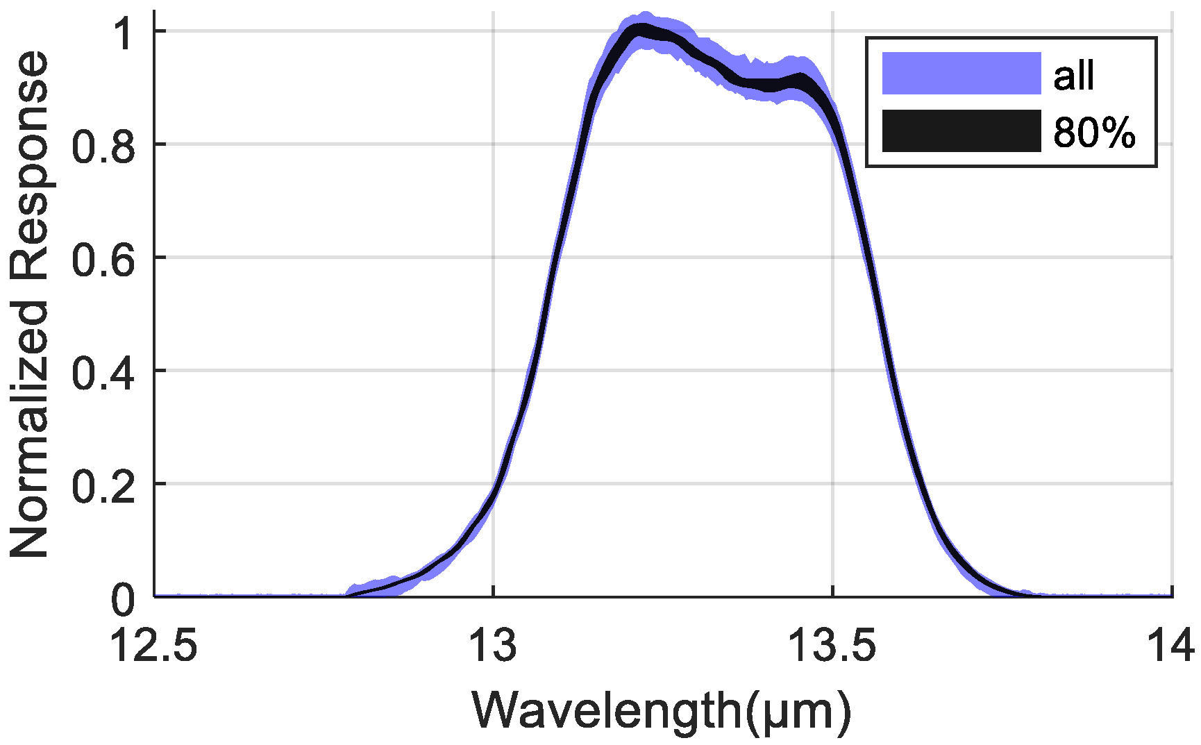 The Spectral Response Function (SRF) is a function of wavelength that describes the relative response of a detector to incident light at different wavelengths. It characterizes how the detector output varies with wavelength when subjected to incident light of unit energy or unit spectral radiance across the spectrum. The ideal SRF shape typically approximates a rectangular window. The SRF is an extremely critical parameter, directly impacting calibration accuracy, uniformity, and retrieval precision. For long-linear-array detectors, it is desirable for the SRF of each detector to be as identical as possible (i.e., having the same curve shape). Significant differences cause individual detectors to receive different effective radiances even from the same target, leading to non-uniformity and adversely affecting subsequent applications. Therefore, the selected detectors should ideally exhibit SRFs that are closely matched [