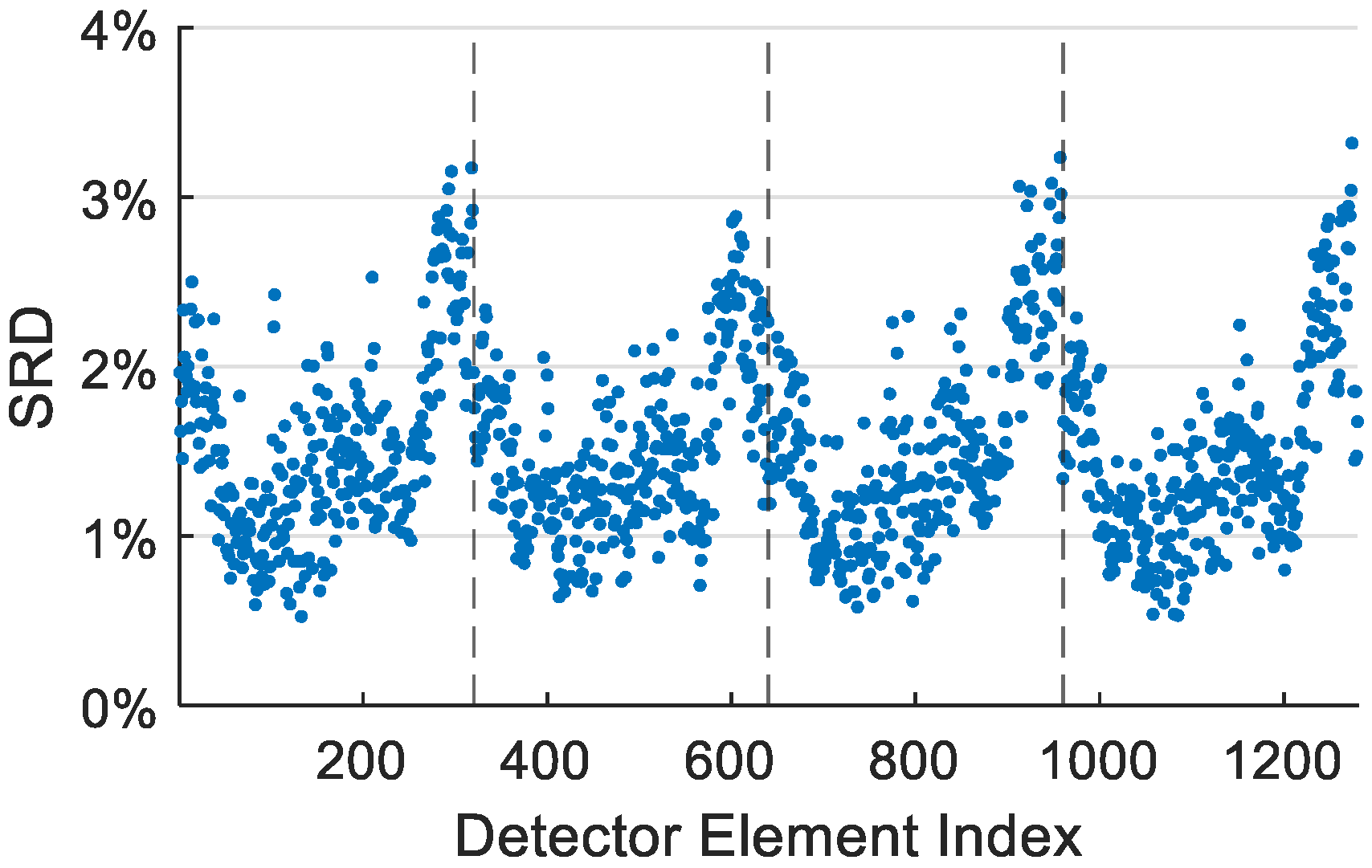 Through this transformation, the Spectral Response Function—originally a uniformity metric—is converted into a negative metric represented by SRD, which can be computed using the modified Z-score method for negative metrics outlined in Equation (12). Furthermore, during the blind detector screening phase, a threshold can be established based on SRD to identify and exclude detectors with excessive SRD as blind detectors, thereby preemptively removing those with anomalous spectral performance at an early stage.