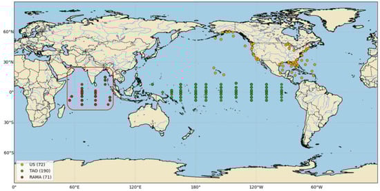 In-situ observations rely on three sets of high-precision buoy arrays, which serve as the true value benchmark for model training (source domain) and evaluation (target domain). The North American NDBC buoys, operated by the U.S. National Data Buoy Center, are distributed in coastal waters of 30°N–60°N, 60°W–140°W, providing 1 h resolution 10 m wind speed data from 2014 to 2020 [22]. Strict quality control procedures have been applied to exclude abnormal records caused by instrument failures or extreme weather events [23,24]. The tropical Pacific TAO buoys, deployed under the Tropical Atmosphere Ocean Project, are located in the region of 10°N–10°S, 120°E–80°W, offering 1 h resolution 10 m wind speed observations over the same period [25]. These data have been widely validated and applied in tropical ocean-atmosphere interaction research and numerical model calibration. The tropical Indian Ocean RAMA buoys, part of the Research Moored Array for African-Asian-Australian Monsoon Analysis and Prediction, are deployed within 23°N–14°S, 53°E–97°E, providing high-quality 1 h resolution 10 m wind speed data from 2014 to 2020. As the core target domain dataset, it supports model fine-tuning and independent testing to ensure the generalization ability of the model in the study area.