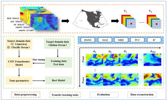 Workflow diagram of the tropical Indian Ocean wind speed reconstruction. The red dots represent the locations of buoy stations along the coast of the Americas. The framework includes four key steps. (1) Data preprocessing: Integrate multi-source meteorological data and match with buoy observations spatio-temporally; (2) model construction: Establish a Branch CNN–Transformer hybrid model, pre-train with source domain data (NDBC/TAO buoys) and fine-tune with target domain (RAMA buoys) data; (3) model evaluation: Select the optimal model via five metrics (RMSE, MAE, MBE, PCC, R2); (4) data reconstruction: Reconstruct the 20-year wind speed field and compare with ERA5/CCMP products.
