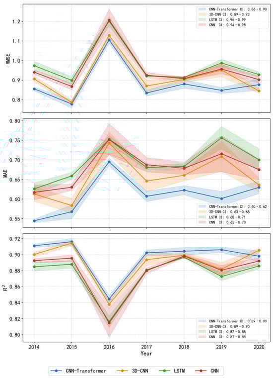 Annual Performance Comparison Across Models (Mean ± 95% Confidence Interval). Note: To assess the impact of training randomness on results, each model employed a leave-one-out cross-validation scheme. Training was repeated using five distinct random seeds (42, 7, 123, 2023, 999), after which the annual metric means and confidence intervals were aggregated.