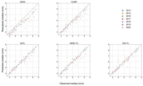 This study employs the median wind speed as the central tendency indicator for typical wind conditions. Through scatter plots (Figure 6) and multi-indicator summaries (Supplementary Materials Table S1), it compares the performance of reanalysis/fusion products (ERA5, CCMP) with three deep learning models(NoTL, NDBC-TL, TAO-TL) at the median level. Figure 6 shows that ERA5’s point cloud deviates systematically downward from the 1:1 line, indicating a general underestimation of typical wind speeds in the TIO region, particularly pronounced in the medium-to-high wind speed range. CCMP partially corrects this bias at low-to-medium speeds but retains a slight negative deviation at high speeds. The point clouds from the three deep learning models show significant convergence and are closer to the diagonal line, indicating that deep learning models reduce both systematic bias and inter-point dispersion. Microscopically: NDBC-TL exhibits slightly tighter median scatter with reduced bias in the mid-to-high wind speed range; TAO-TL shows more outliers at extreme high or low observations; NoTL (directly trained on the target domain) aligns with NDBC-TL in the low-to-mid wind speed range but occasionally exhibits slight rebound at high speeds, suggesting that climate similarity between the pre-training source domain and target domain affects the stability of median estimation.