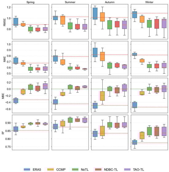 Among the deep models, TAO-TL stands out in summer with upper quartiles and whiskers that better align with observed high-wind variability, indicating improved recovery of strong seasonal events. NDBC-TL shows the tightest distributions in spring and low-amplitude seasons, reducing random fluctuations and providing conservative corrections. NoTL delivers the most balanced seasonal fit, with medians and spreads matching observations in multiple seasons and fewer extreme outliers.