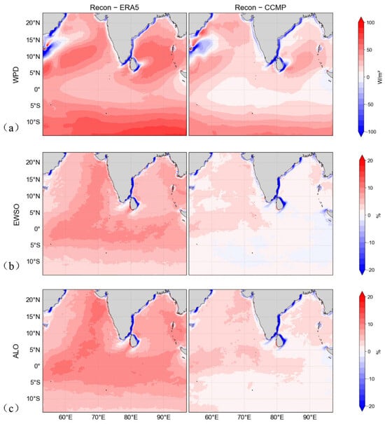 Comparison of 20-year average wind speeds in the tropical Indian Ocean region between ERA5 wind speeds, CCMP wind speeds, and wind speeds reconstructed using the NoTL model. (a) WPD; (b) EWSO; (c) ALO.
