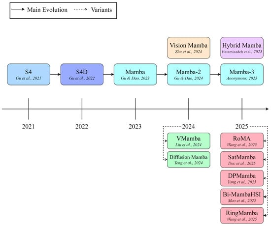 Bao et al. recently presented the first dedicated survey of Vision Mamba techniques in remote sensing, organising roughly 120 studies by backbone design, scan strategy, and application task [16]. Complementary surveys of visual Mamba architectures in generic computer vision [17,18,19,20] and the broader Mamba-360 review of state-space models, which categorises foundational SSMs into gating, structural, and recurrent paradigms across modalities, further situate Mamba within the wider SSM landscape [21]. Building on these efforts, this review adopts an EO-centric perspective and deliberately narrows its focus to questions that are specific to, or particularly critical in, Earth observation. Figure 1 summarises the evolution from foundational SSMs to the Mamba family, together with representative vision and EO variants. We use this timeline as a reference point for the scan mechanisms, hybrid paradigms, and application taxonomies discussed next.