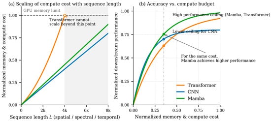 Figure 2 summarizes the compute–accuracy trade space of long-range operators from a remote-sensing workload perspective. The key takeaway is not that Mamba universally outperforms attention, but that linear-time mixing makes long-context modeling feasible under RS sequence lengths that quickly render quadratic attention impractical. This is why scan design and hybridization, rather than a backbone swap alone, dominate real EO performance.