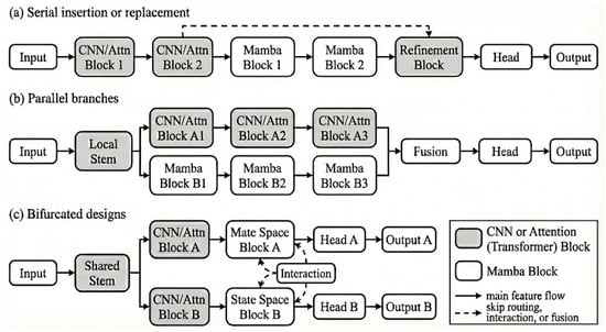 A first family of designs follows Serial integration in Figure 4a. It attaches Mamba blocks to convolutional encoders or decoders for dense prediction. Typical U Net style hybrids retain a CNN encoder to capture local textures and object boundaries and replace bottleneck or decoder stages with Mamba layers so that large-scale context is propagated with linear complexity [47,59,60,61,62]. For very-high-resolution segmentation and change detection, CNN–Mamba U-Net variants scale to ultra-large tiles by pairing shallow convolutional stems with deep Mamba decoders. Skip connections preserve fine detail while the decoder aggregates global context [47,63].