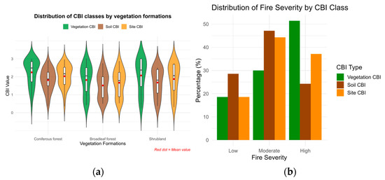 Distribution of (a) Composite Burn Index (CBI) values by CBI level and vegetation formation, and (b) the percentage of plots by CBI type and fire severity level in the Sierra de la Culebra wildfire.