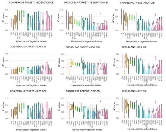 The correlations derived between hyperspectral indices and CBI exhibited considerable variability (Figure 4), ranging, for instance, from 0% to 75% within a single VI formulation. Conversely, some indices displayed a narrow correlation range (i.e., 60–70%), suggesting that these hyperspectral VIs convey similar spectral information. Such variability is expected, as specific VI formulations incorporate spectral bands with a large number of hyperspectral wavelengths (Table S1a). This variability is expected because several VI formulations rely on a broad set of hyperspectral wavelengths (Table S1a), which differ in their sensitivity to fire-induced changes. Consequently, correlation strength depends strongly on the specific band combinations selected, with only a subset producing robust relationships with CBI. Furthermore, the R2 distributions associated with each hyperspectral VI formulation showed marked differences in shape (Figure 4). Uniform, rectangular-shaped envelopes indicate similar explanatory power across band combinations, whereas conical or violin-shaped patterns reveal that only a subset of combinations yields moderate to high correlations with CBI.