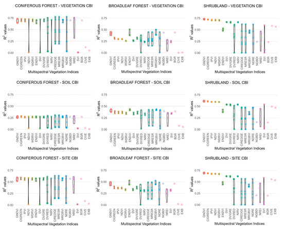 Hyperspectral VI formulations exhibited R2 distributions that were either narrowly clustered, indicating stable performance across band combinations, or widely dispersed, reflecting strong sensitivity to band selection. As a result, band shifts in the VI formula using adjacent spectral bands exert a substantial influence on hyperspectral index values. This sensitivity is attributed to the availability of narrow, contiguous bands, which allow for more precise detection of biochemical changes in vegetation and soil properties following fire [40]. This pattern is consistent with previous hyperspectral studies showing that distinct index formulations can converge toward comparable explanatory power when sensitive spectral regions are involved [45,46,47]. Indeed, some VI formulations demonstrated high explanatory power for CBI with numerous hyperspectral band combinations, for example, in coniferous forest at the vegetation CBI level and shrubland at the soil CBI level, among others. By contrast, multispectral indices demonstrated reduced variability, attributable to the smaller number of possible band combinations. Additionally, multispectral indices showed lower sensitivity than hyperspectral indices in detecting fine-scale spectral variations, particularly in transition zones between fire severity classes. For instance, several multispectral VI formulations exhibited strong correlations, indicating that multiple indices can effectively characterize fire-induced vegetation damage, such as in coniferous forests at the vegetation-level CBI. In contrast, a similar pattern of consistently weak correlations was observed in the coniferous forests at the soil level.