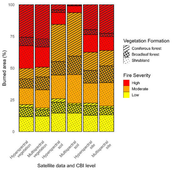 Percentage of burned area by vegetation formation and fire severity category (low, moderate, and high), shown separately for each CBI level (vegetation, soil, and site) and sensor type (hyperspectral and multispectral).