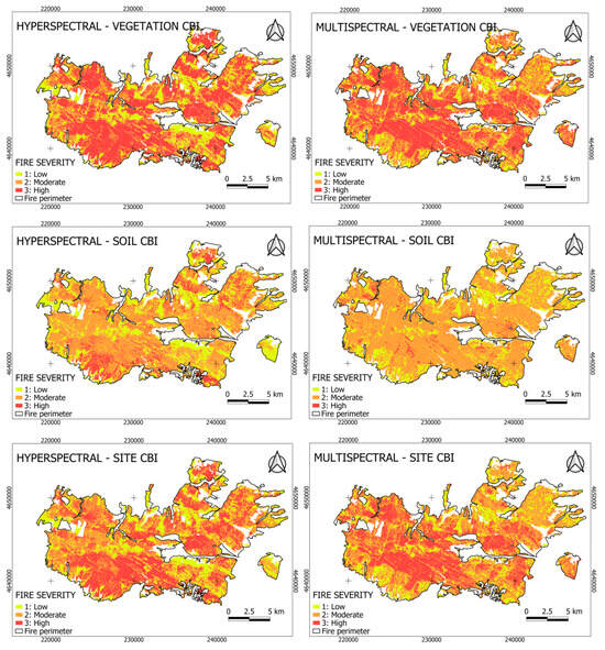 Fire severity at the three CBI levels was spatially mapped within the wildfire perimeter using the best-performing VIs for each sensor type and vegetation formation (Table 1). Overall, both hyperspectral and multispectral data revealed similar spatial patterns (Figure 6), with high fire severity dominating at the vegetation level, affecting approximately half of the study area (hyperspectral: 50.2%; multispectral: 49.2%), followed by moderate (H: 28.5%; M: 32.1%) and low (H: 21.3%; M: 18.3%) fire severity. At the soil level, moderate fire severity prevailed, particularly in the multispectral data (71.3%) compared to hyperspectral imagery (58.5%), while high-severity areas decreased accordingly (H: 15.5%; M: 6.3%). At the site level, moderate fire severity accounted for nearly half of the area (H: 40.0%; M: 43.8%), exceeding both high (H: 37.5%; M: 36.0%) and low severity (H: 22.6%; M: 20.2%) levels. Among vegetation formations, coniferous forests and shrublands were the most affected across all CBI levels. At the vegetation level, coniferous forests (H: 25.6%; M: 26.9%) and shrublands (H: 17.8%; M: 15.8%) exhibited the highest proportions of high-severity burns, while at the soil level, shrublands showed the greatest impact (H: 9.4%; M: 5.4%). Under moderate fire severity, coniferous forests and shrublands again represented the largest affected areas across CBI strata, whereas shrublands maintained a relatively stable proportion of low-severity burns (≈12–15%) across all levels.