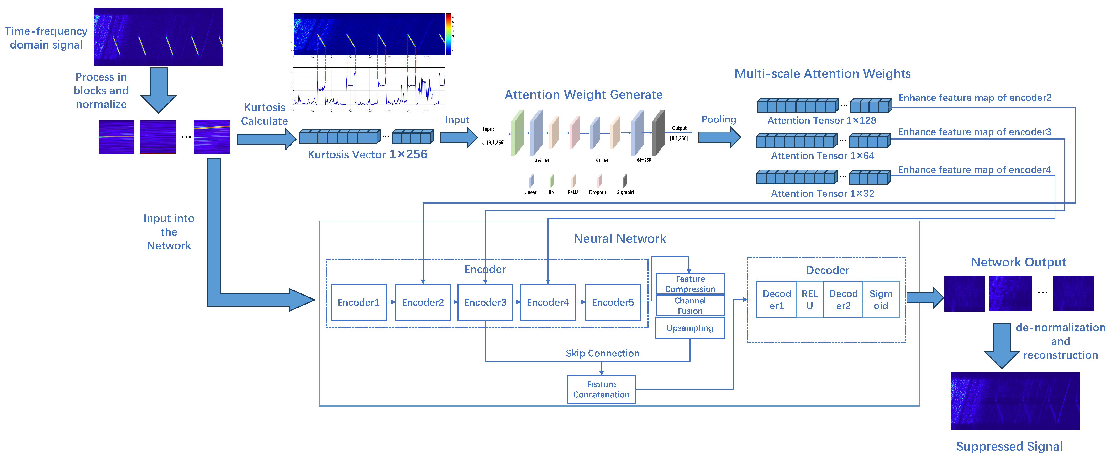 This chapter elaborates on the core principles and architectural design of the proposed kurtosis-guided attention-based interference suppression network (KANet). The main innovation of this method lies in the design of a kurtosis prior guidance module. Its effectiveness is based on the significant difference in the statistical distributions of SAR signals and RFI. This module aims to quantify the impulsive characteristics of the signal along the time dimension, thereby generating a statistical metric capable of accurately identifying RFI.