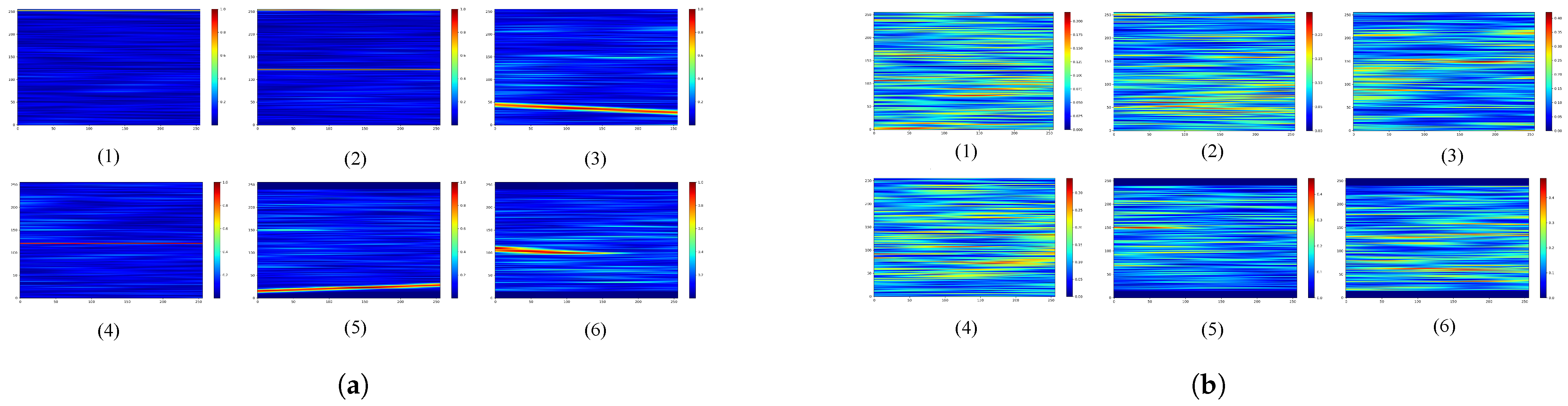 Figure 3 presents the analysis across four distinct scenarios, displaying SAR images alongside time-frequency domain spectrograms and their corresponding time-sequenced kurtosis curves. The results demonstrate a precise temporal alignment between kurtosis peaks and RFI presence. In the interference-corrupted cases (Scenarios 1, 2, and 3), the kurtosis values increase significantly, exhibiting a strong response to RFI. In contrast, Scenario 4 confirms the metric’s robustness against complex ground echoes: in the absence of RFI, the kurtosis curve remains stable at a low level despite the presence of strong terrain backscatter. This verifies that the kurtosis metric effectively targets impulsive interference while remaining insensitive to typical Gaussian-like background echoes.