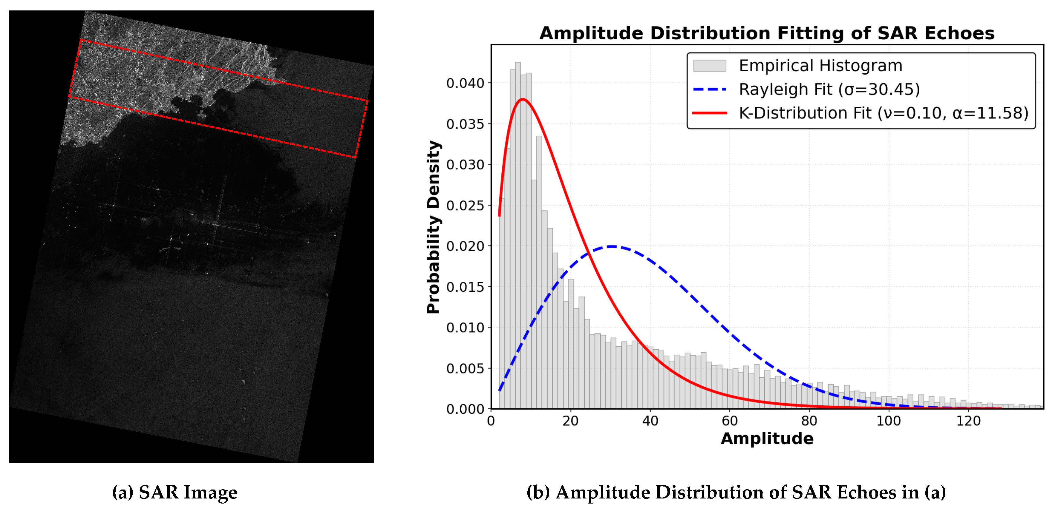 is traditionally modeled as the coherent superposition of numerous independent scatterers within a resolution cell. According to the Central Limit Theorem (CLT), this leads to a complex Gaussian representation of the echo and Rayleigh distribution for its amplitude. While the Rayleigh model provides an adequate description for homogeneous media, SAR echoes often exhibit pronounced spatial heterogeneity due to complex ground textures and land cover variability, resulting in heavy-tailed statistics that deviate substantially from the Rayleigh distribution. To accurately capture this behavior, we employ the K-distribution, which arises from a multiplicative combination of Rayleigh speckle and Gamma distributed texture [