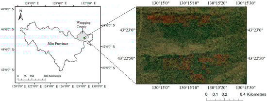 The study area is located in Jingouling Forest Farm of Wangqing Forestry Bureau, Jilin Province, China (130°05′~130°20′E, 43°17′~43°25′N), with an altitude of about 762 m. As in the northern temperate monsoon zone, the annual average temperature is about 3.9 °C, the annual precipitation is 600–700 mm, and the plant growth period is about 120 days. The soil type is mainly dark brown soil. The main coniferous tree species in the study area include Abies nephrolepis (Trautv.) Maxim., Picea jezoensis var. microsperma (Lindl.) Cheng et L.K. Fu, Pinus koraiensis Sieb. et Zucc., and Larix olgensis Henry. The main broad-leaved tree species include Betula platyphylla Suk., Tilia amurensis Rupr., Betula costata Trautv., Fraxinus mandshurica Rupr., Populus ussuriensis Kom., and Acer mono Maxim.