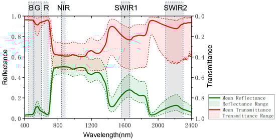 Among 1200 sample plots of 10 m × 10 m, a total of 350 sample plots with the main tree species of Abies nephrolepis (plant ratio > 65%) were selected as the study object of this article (Figure 1). The modeling of complex mixed forests was not the focus in this study. Due to the fact that leaf spectra change with the growth status of trees, it is not possible to obtain real-time in situ leaf spectral data during the logging year. In order to enhance the universality and repeatability of this study, we obtained a total of 200 reflectance and transmittance data of Abies foliage from the EcoSIS public dataset [30,31,32], and we took the average value as the Abies foliage spectral data (Figure 2). We downloaded the 30 m resolution multispectral remote sensing images of Landsat-8 and the 2 m resolution panchromatic images of Gaofen-1 during the cloud-free growing season from 2013 to 2025 in the study area. The Landsat-8 bands used in this study included six bands: Blue (450–515 nm), Green (525–600 nm), Red (630–680 nm), Near-Infrared (845–885 nm), Shortwave Infrared 1 (1560–1660 nm), and Shortwave Infrared 2 (2100–2300 nm). We used the Gram Schmidt Pan Sharpening tool of ENVI software (Environment for Visualizing Images, Version 5.6, developed by Exelis Visual Information Solutions) for image fusion to obtain the annual 2 m resolution multispectral fusion images. Note that the imagery from 2013 to 2025 provided validation of ZELIG-SRT for dynamic spectral simulations, and only the imagery from 2013 to 2016 were used for dAGB inversion.