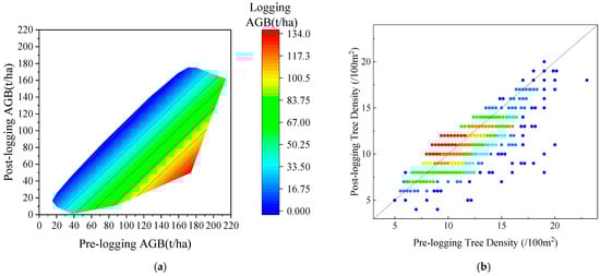 The distribution of pre- and post-logging AGB (a) and tree density (b) of the sample plots.