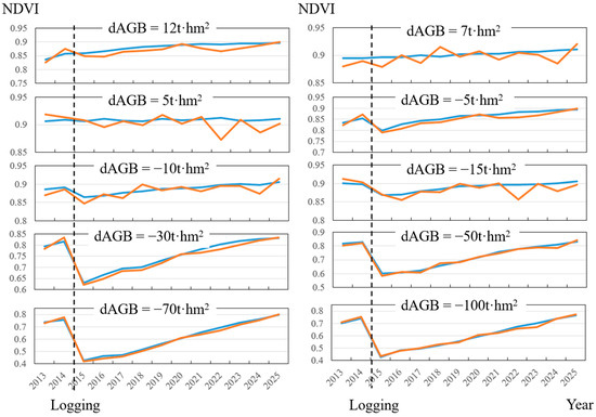 The annual canopy NDVI from 2013 to 2025 of 10 sample plots with different logging intensities in 2015. dAGB indicates the difference between the biomass in 2016 and 2013. The blue line represents simulated NDVI of ZELIG-SRT, and the orange line denotes the extracted NDVI from imagery.