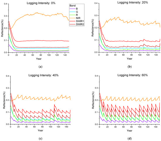 The annual change in canopy reflectance during the simulated forest harvesting cycle for the six bands corresponding to Landsat-8. (a–d) represent the stands with logging intensities of 0%, 20%, 40% and 60%, respectively.