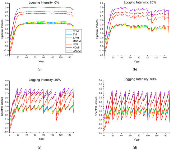 The annual change in the canopy spectral indices during the simulated forest harvesting cycle. (a–d) represent the stands with logging intensities of 0%, 20%, 40% and 60%, respectively.