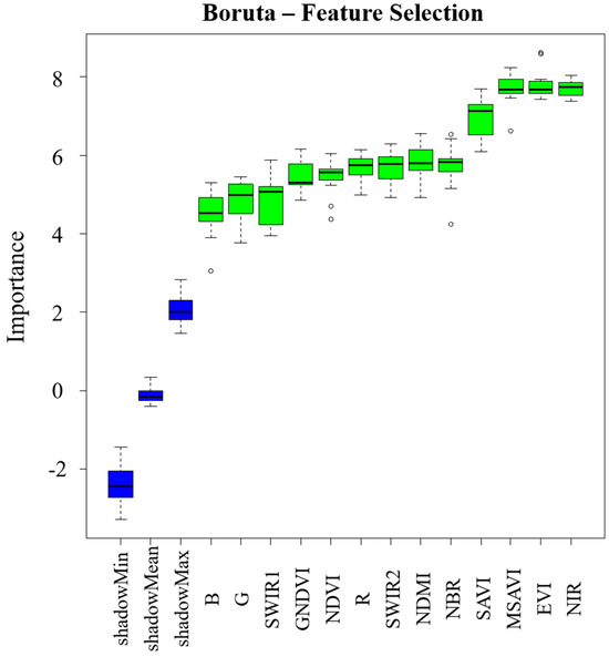 (2) Feature variable selection. The canopy reflectance of 6 bands and 7 spectral indices (Table 4) was used as feature variables. We used the Boruta function package in R software to perform nonlinear selection of feature variables, with the annual differences in reflectance of 6 bands and 7 spectral indices in the look-up table as explanatory variables and the annual difference in AGB (dAGB) as the dependent variable. The number of decision trees ntree in the Boruta model was set as 150 for the stability of the model, while other parameters remained default. The features of relatively higher importance were selected for inversion.