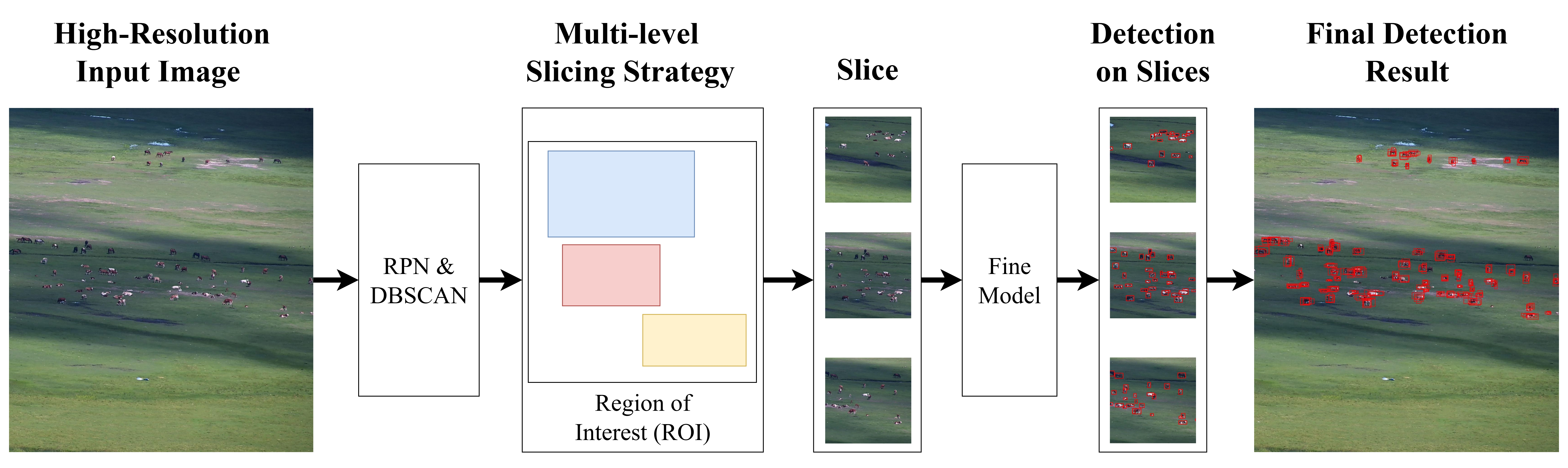 - Multi-Level Slicing and Fine-Grained Detection: Applying a multi-level slicing strategy to crop the generated ROIs and then invoking a high-performance model for precise detection.