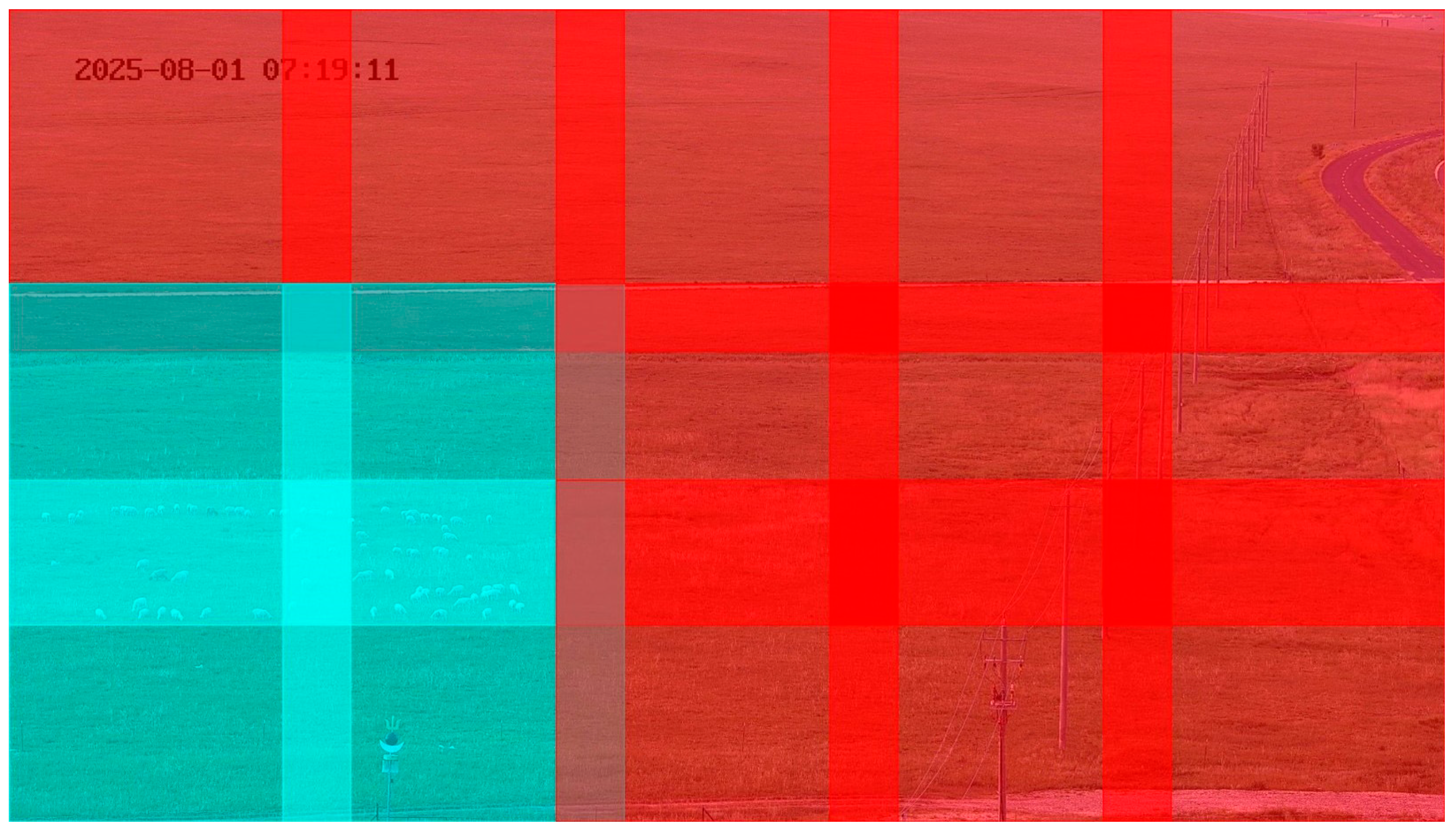 - Grid Slice Strategy: If a standard grid slice is applied to a large ROI with only one long edge exceeding the threshold, it may lose context on the short edge that could contain valid information. Therefore, this study proposes a hybrid slicing strategy combining centering and grid slicing. First, define the slice step size P = S (1 − O). Then, a set of starting offsets must be calculated for the X-axis and Y-axis separately. For any given axis (using the X-axis as an example, with its starting point in the ROI as x1 and its size as WR), the set of offsets OffsetX is:The calculation for OffsetY is identical to OffsetX. The final generated set of slices Cgrid is the Cartesian product of these two offset sets:This performs a sliding-window slicing along the length and width of the ROI at a certain overlap rate, ensuring complete coverage of the entire area while also ensuring that each slice’s dimensions are within a range the model can efficiently process.