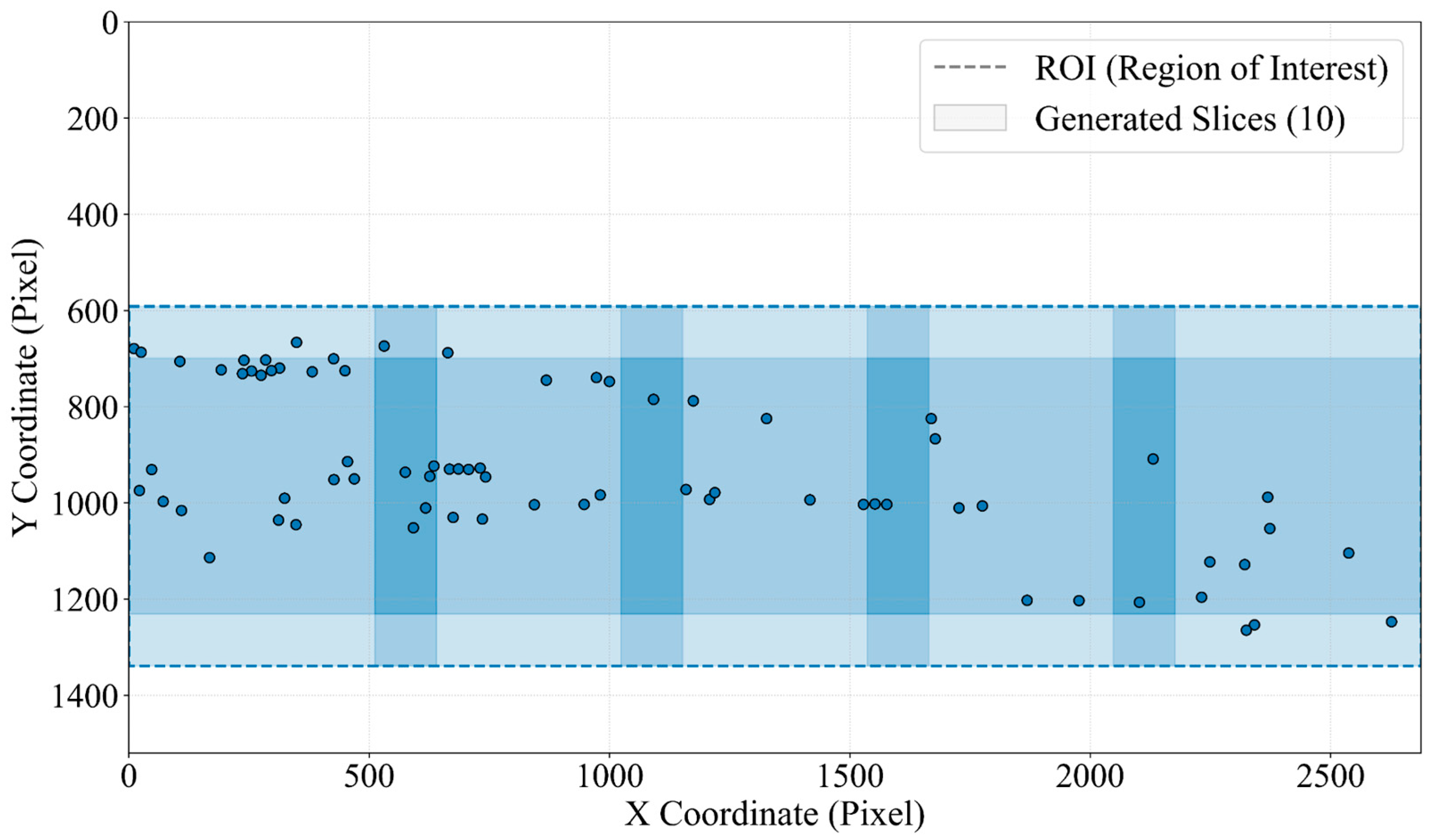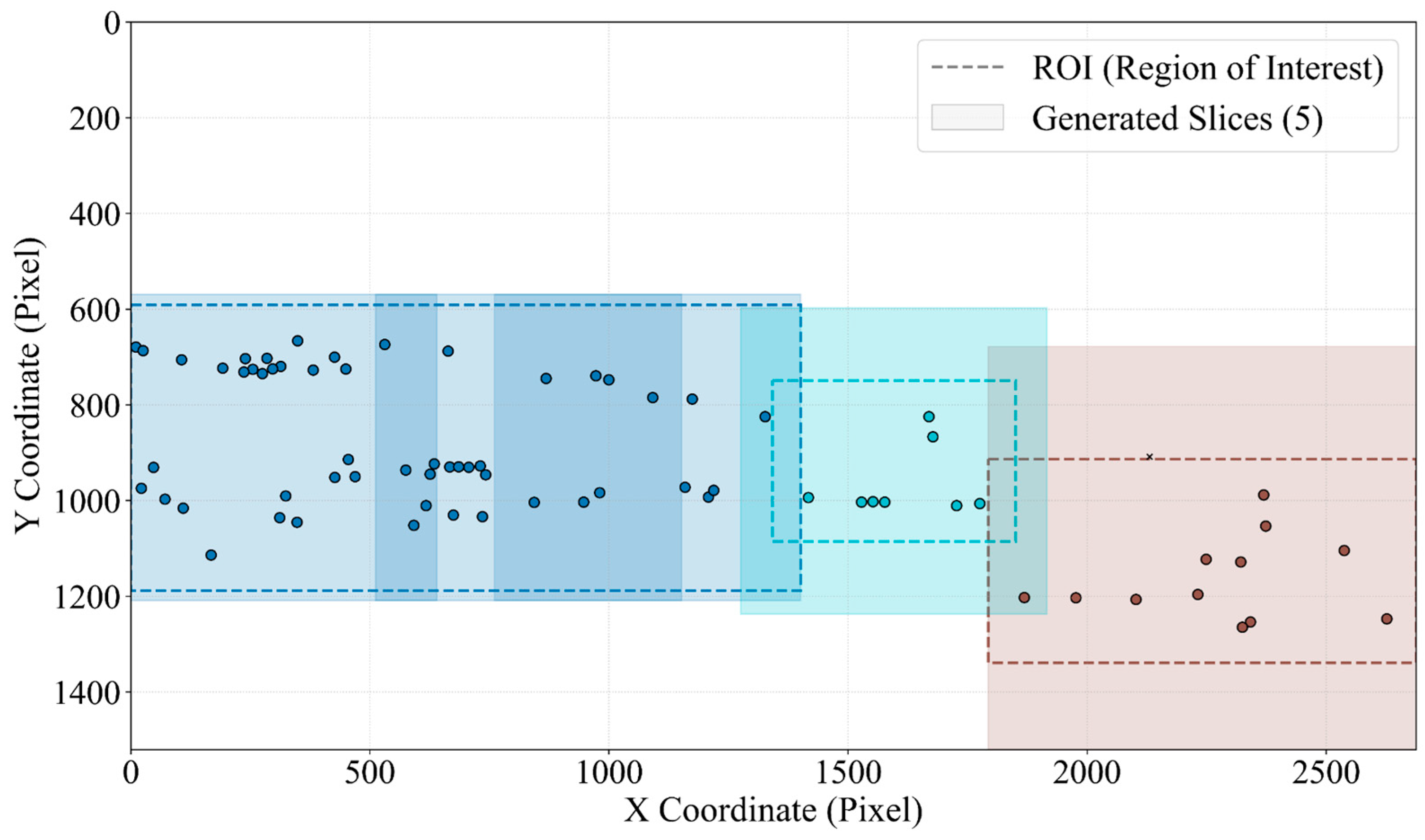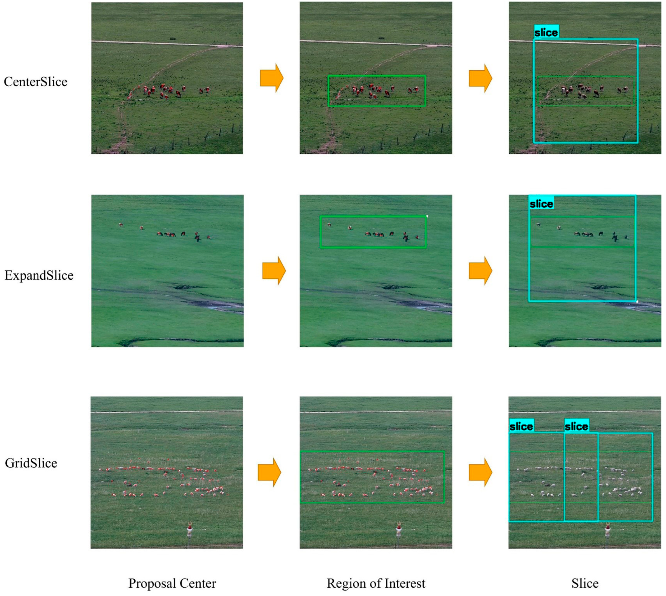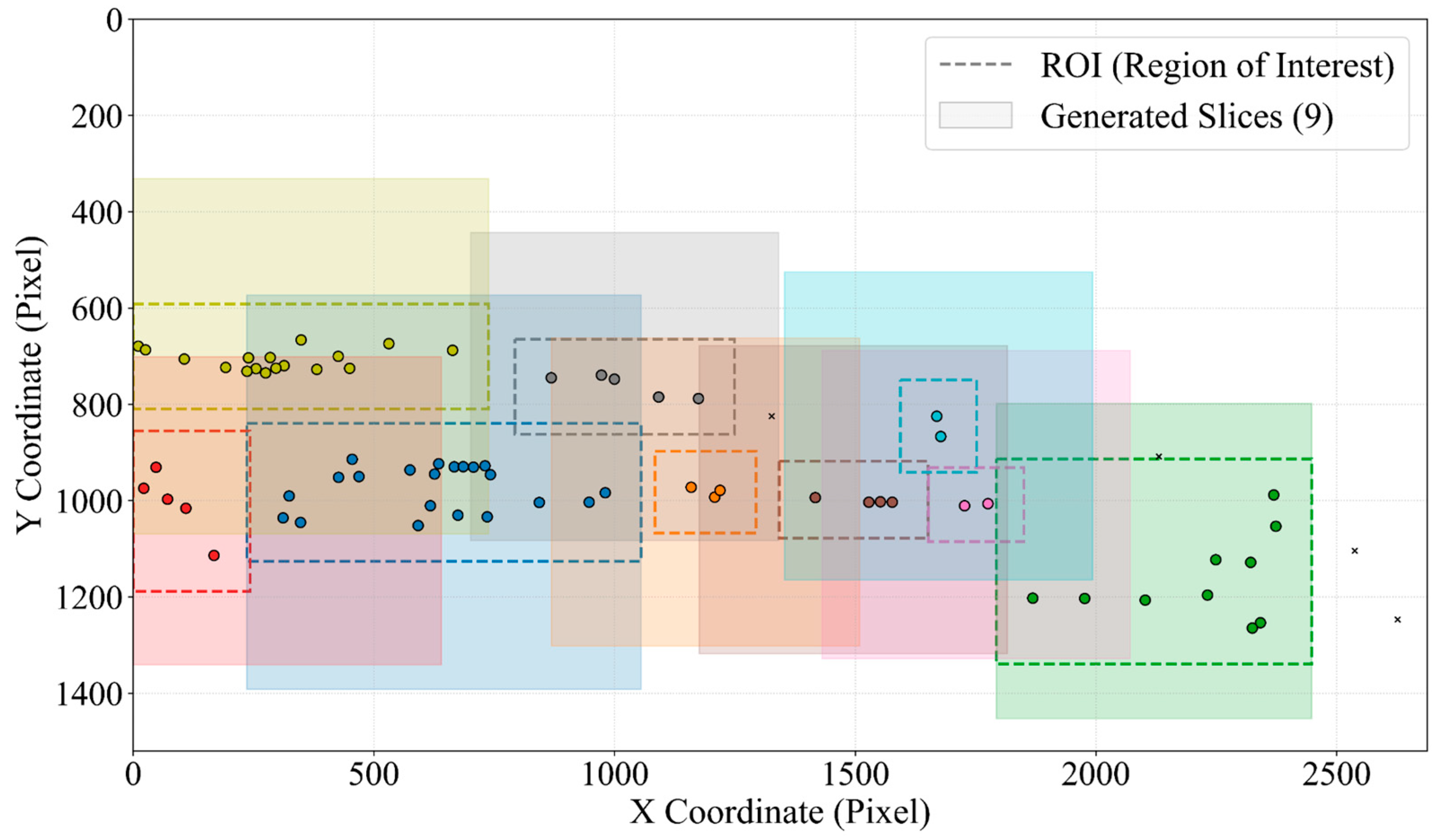 - Center Slice Strategy: When the ROI’s dimensions are less than or equal to the standard slice size, we adopt the center slice strategy. Let the center point of the ROI be (cx, cy). The single generated slice’s coordinates are:This is the most efficient solution and provides sufficient contextual information for small target clusters.