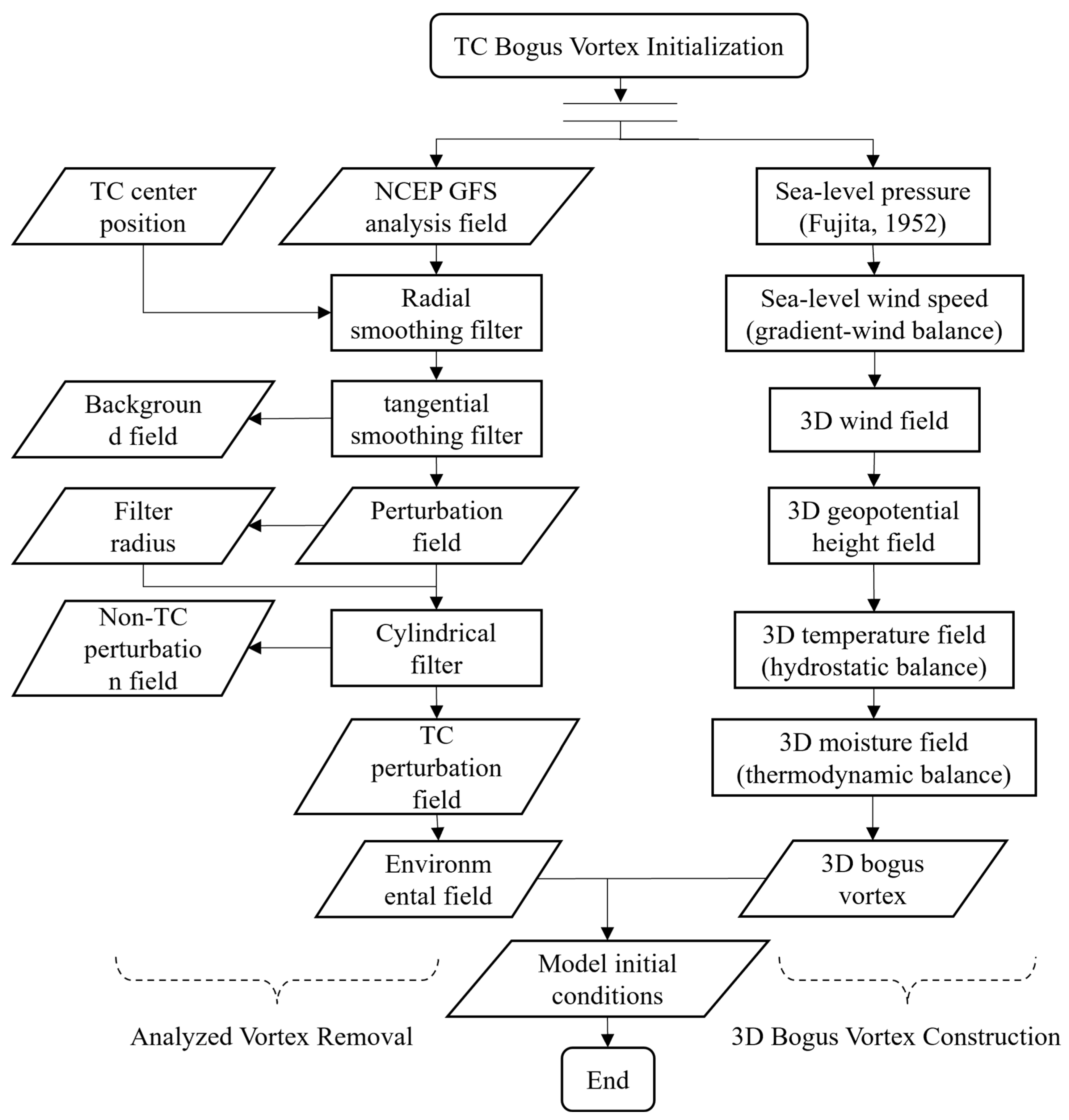 - Remove the analysis vortex and merge the 3D axisymmetric bogus vortex with the environmental background field.