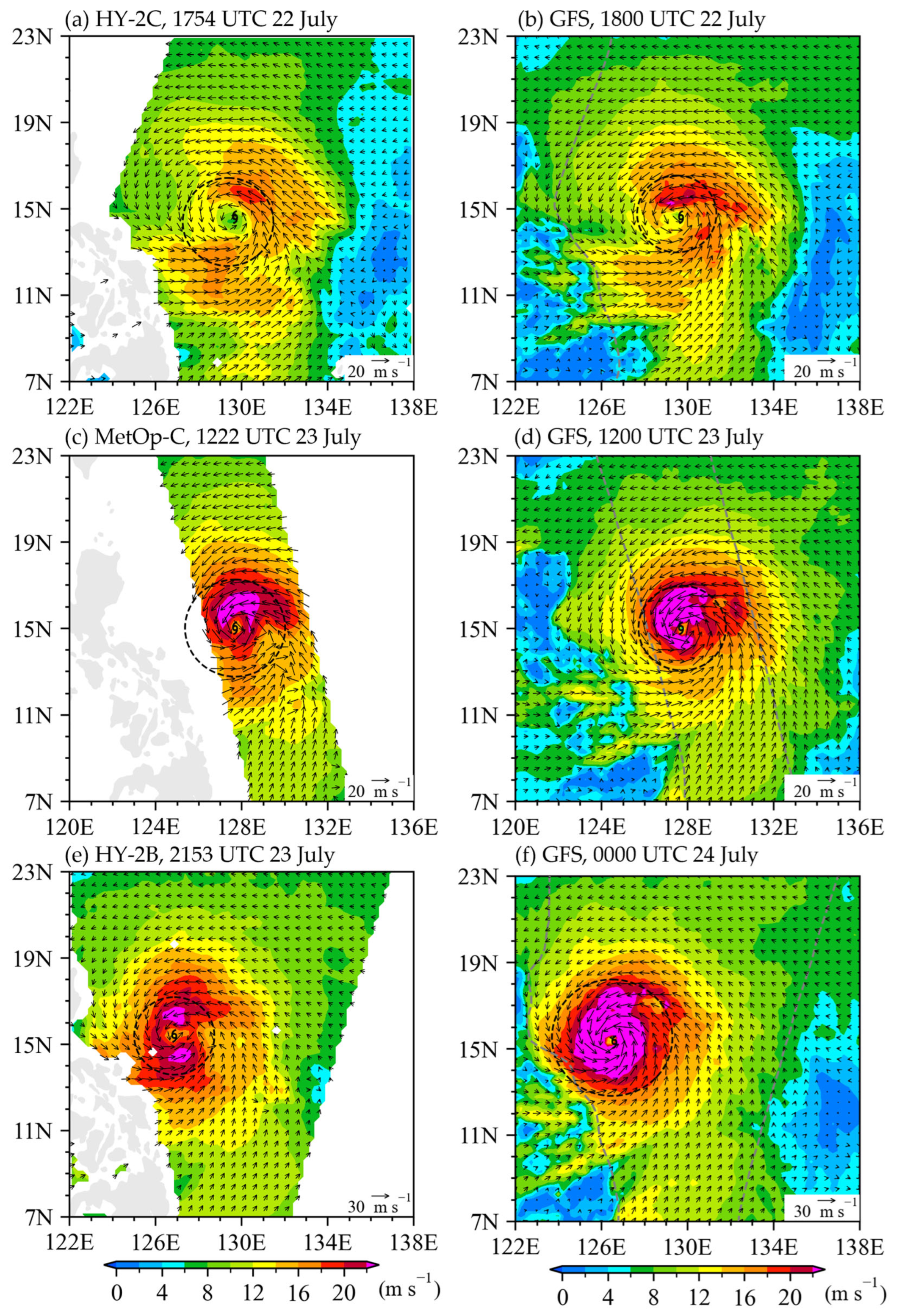 - Zhang, D.; Zhang, Y.; Hu, T.; Xie, B.; Xu, J. A comparison of HY-2 and QuikSCAT vector wind products for tropical cyclone track and intensity development monitoring. IEEE Geosci. Remote Sens. Lett. 2014, 11, 1365–1369. [Google Scholar] [CrossRef]