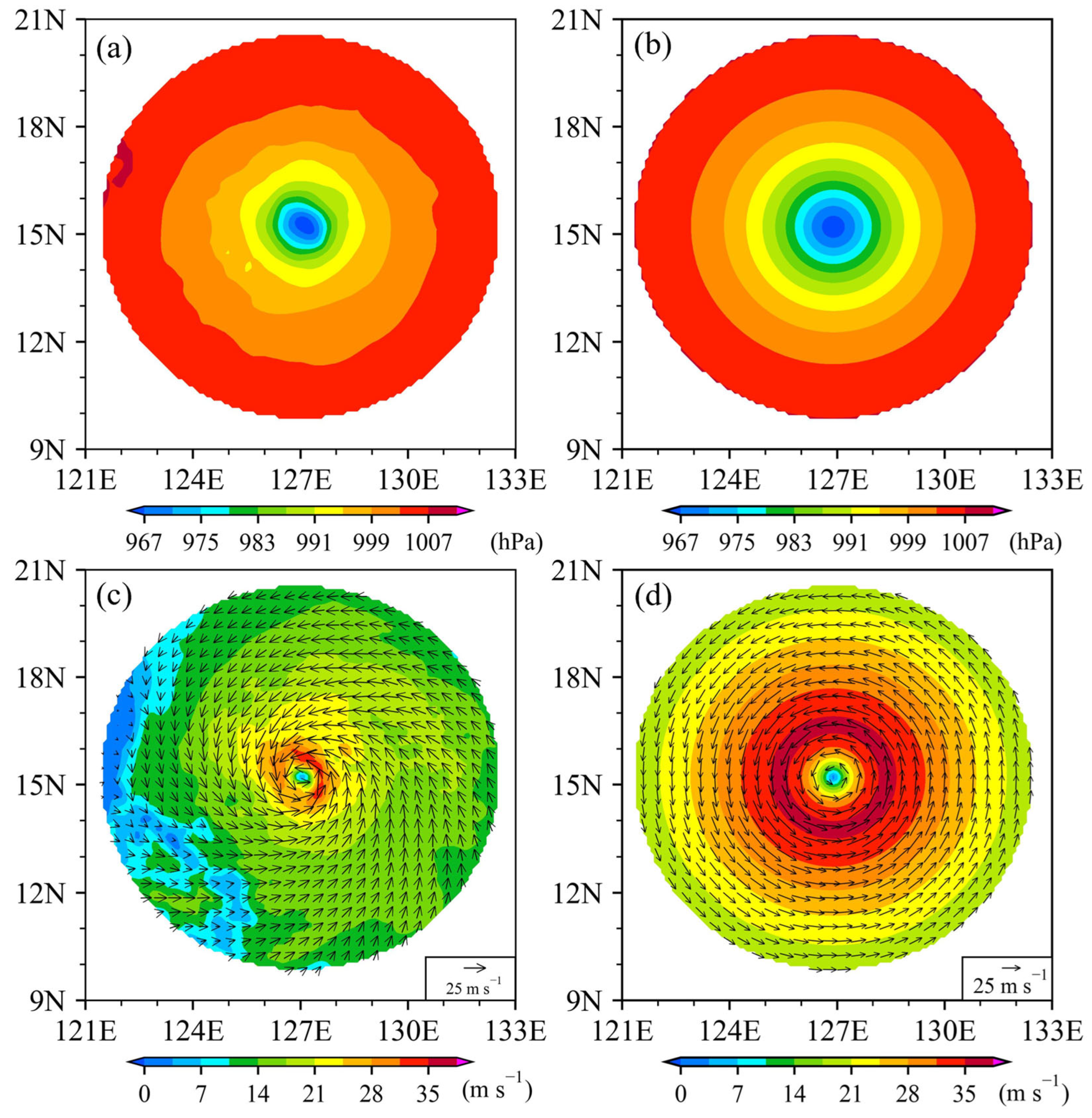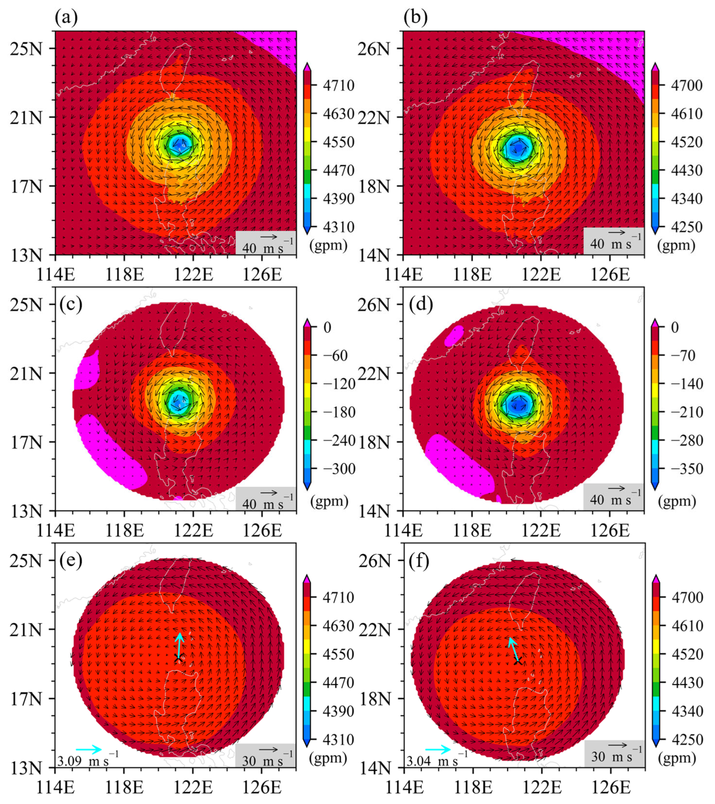 - Pan, W.; Zou, X.; Duan, Y. Developing an Objective Scheme to Construct Hurricane Bogus Vortices Based on Scatterometer Sea Surface Wind Data. Remote Sens. 2025, 17, 1528. [Google Scholar] [CrossRef]