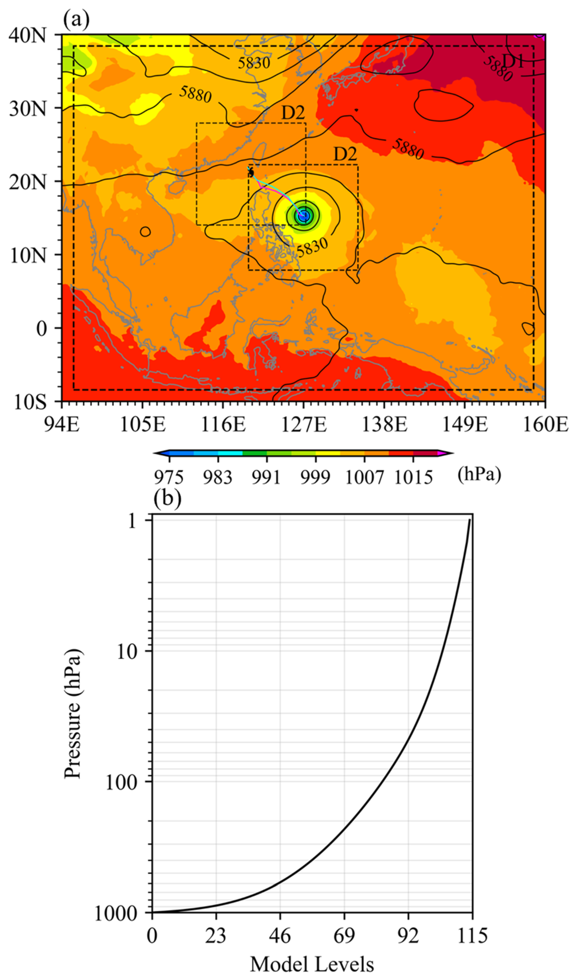 - Derive the three-dimensional (3D) axisymmetric bogus vortex from the two-dimensional (2D) axisymmetric SLP using gradient wind balance and an empirical vertical distribution of wind;