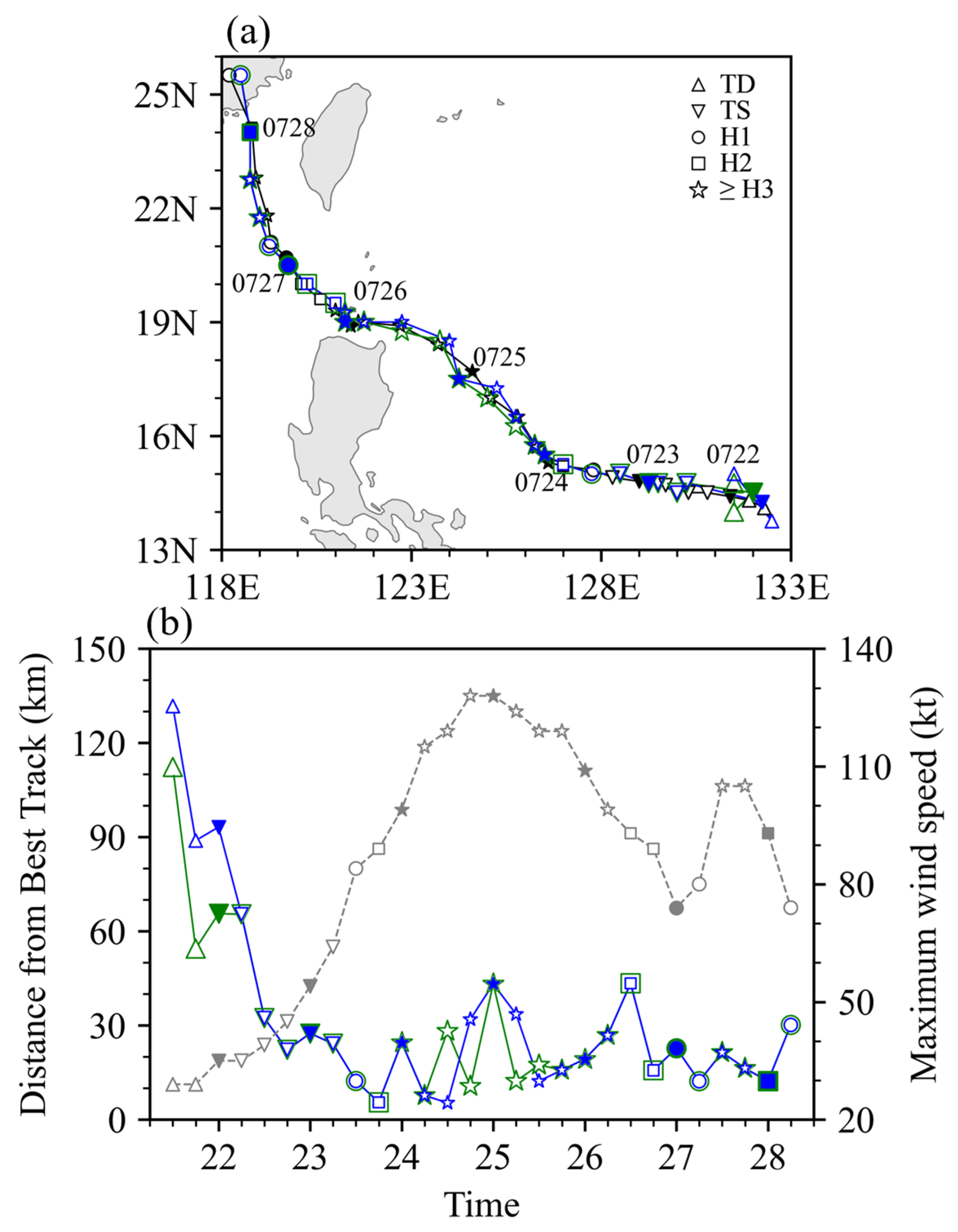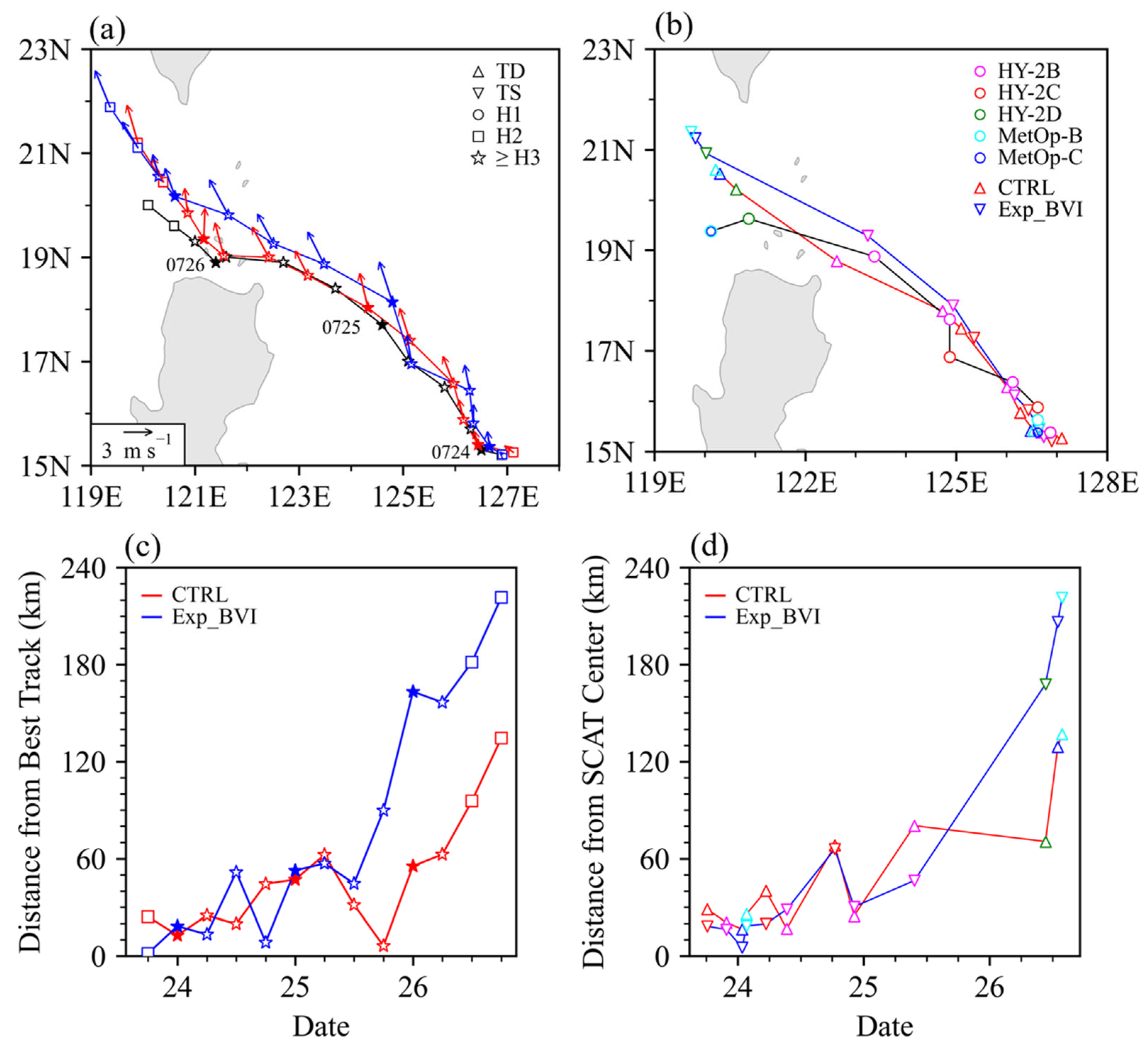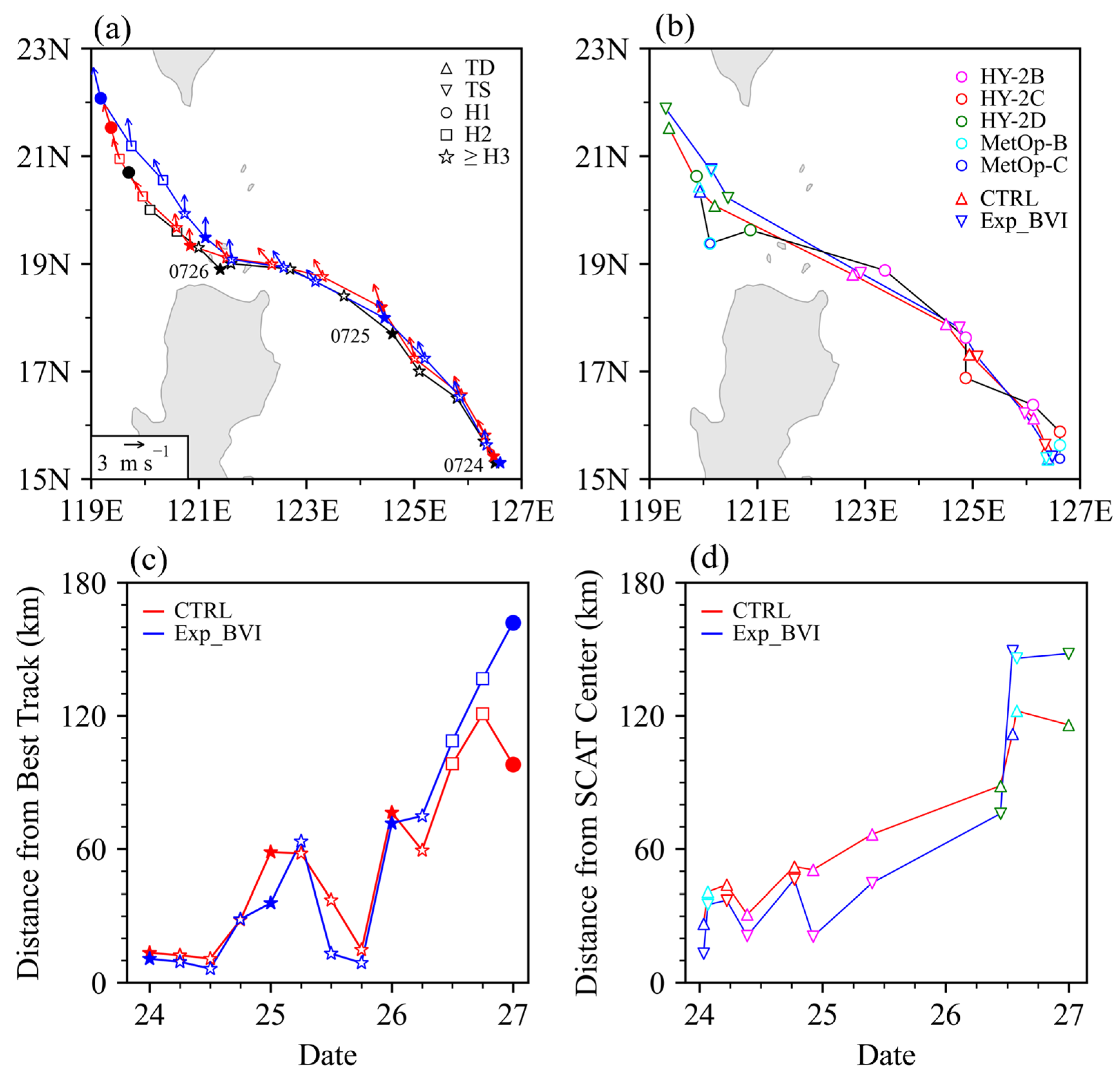 4.3.2. Impact of BVI on Intensity and Track Forecasts of Typhoon Doksuri