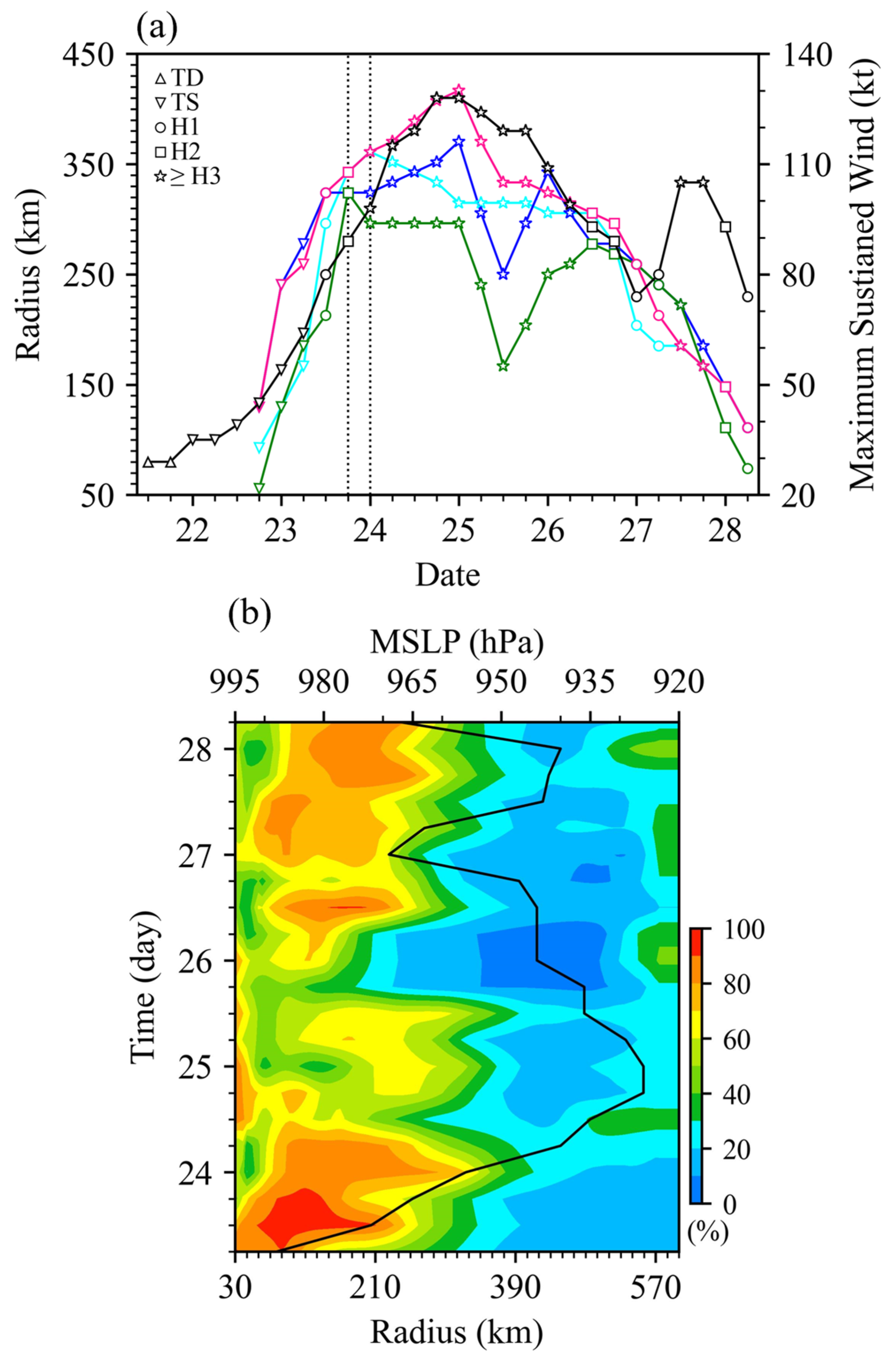 - Chavas, D.R.; Knaff, J.A. A simple model for predicting the tropical cyclone radius of maximum wind from outer size. Weather Forecast. 2022, 37, 563–579. [Google Scholar] [CrossRef]