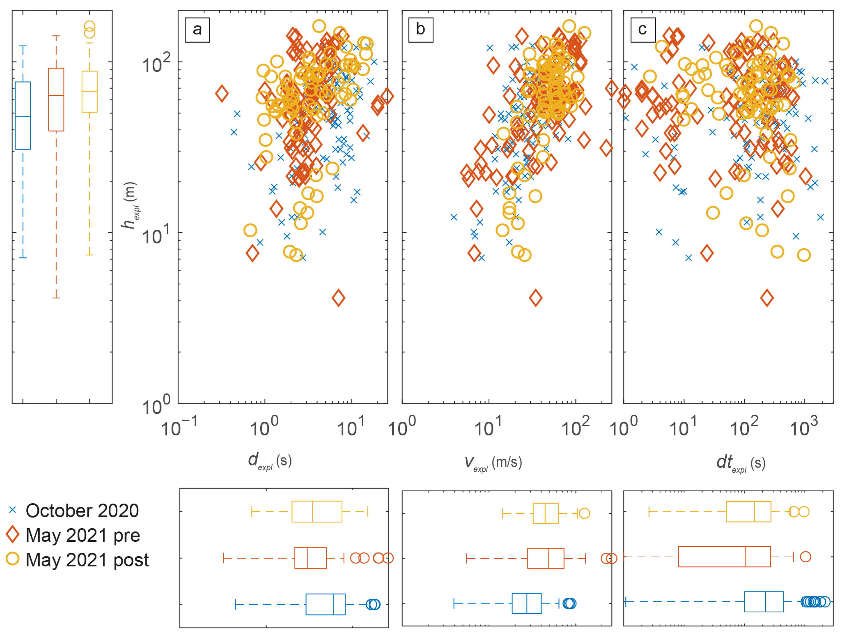 - Explosion frequency for each manually picked explosion was calculated as the inverse of the inter-event time dt, the time between two consecutive explosions at the same area or vent: