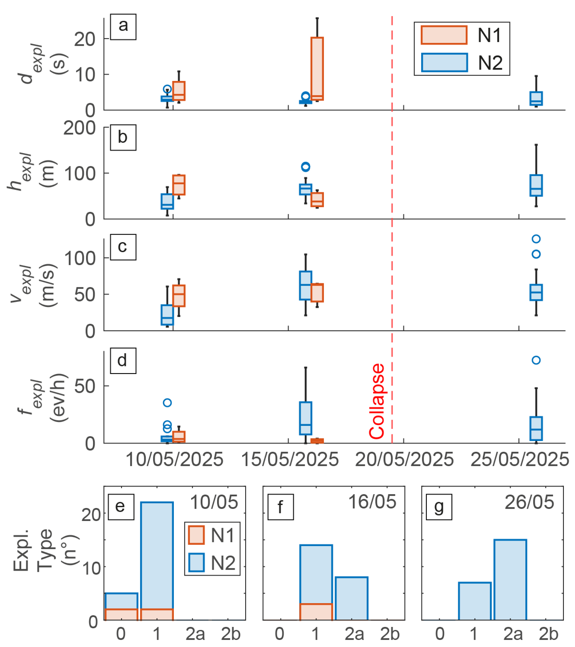 - Before the May 2021 collapse at Stromboli, explosions intensified in frequency, spattering, bomb- and gas-rich events, and number of active vents (including gas-dominated explosions, puffing and spattering).