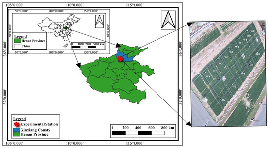 The study area is in the Farmland Irrigation Research Institute Comprehensive Experimental Station in Qiliying, Chinese Academy of Agricultural Sciences, located in the North China Plain (NCP) at 35°18′11′′N and 113°55′34′′E and 81 m above sea level. The region has a warm, subtropical climate with an average annual rainfall of approximately 573 mm, with 65 to 70% of this rain falling during the summer months from June to September. The experiment site has an average annual solar radiation of 4900 MJ m−2 yr−1 and an average temperature of 14.5 °C, respectively, with between 189 and 240 frost-free days per year. The site has a weather station for recording daily weather results (temperature (°C), wind speed (ms−1), net radiation, relative humidity (%), rainfall (mm), etc.) and averaging them every thirty minutes. Soil bulk density, porosity, and field capacity are shown in Table 1, while the study area is presented in Figure 1.