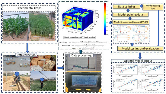 After spectral data collection, a single maize plant and five representative wheat plants were collected for water content measurement, with one plant per replicate. The winter wheat samples included all tillers from one germinated seed. The fresh maize plants were separated into leaves and stems, and their weights were recorded immediately using an electronic balance with a 0.01 g error. The above-ground wheat plants were placed in a sealable plastic bag and weighed in a similar format to the maize. The summer maize plant weight was calculated by summing the weights of the leaves and stem. After weighing, the samples were taken to the oven for drying. Samples were dried at 105 °C for thirty minutes, followed by 75 °C until constant weight was achieved. Plant moisture content was calculated using Equation (1). During data collection campaigns, soil samples were simultaneously collected to analyse the gravimetric soil moisture content. The workflow of this work is presented in Figure 2.