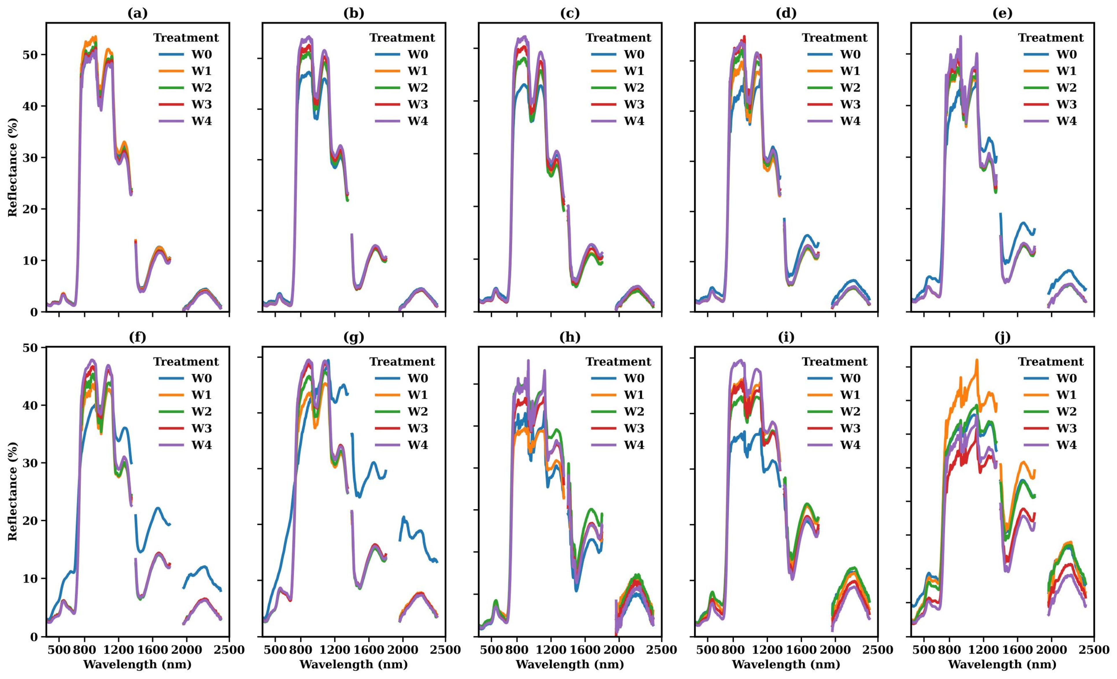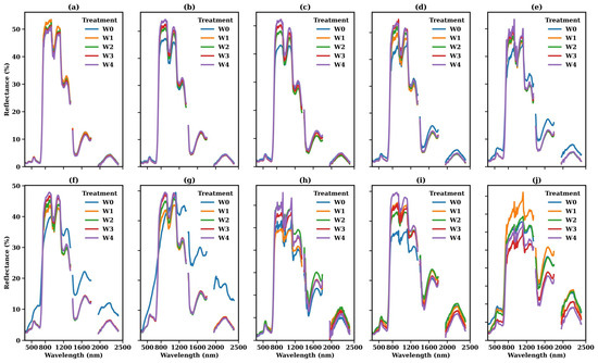 This figure presents the canopy spectral reflectance of winter wheat and summer maize by growth stage and treatment. (a–g) represent booting, heading, flowering, filling, dough, ripening and maturity, respectively, for winter wheat, while (h–j) represent tasseling, milking, and hard dough stages, respectively, for summer maize.