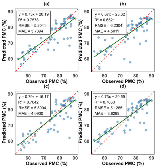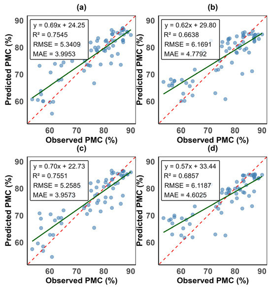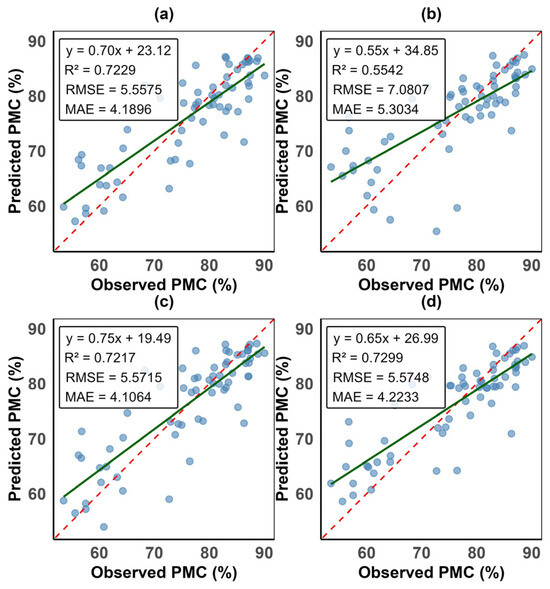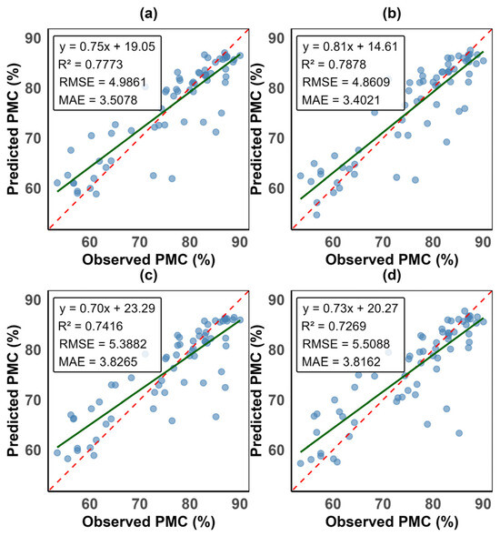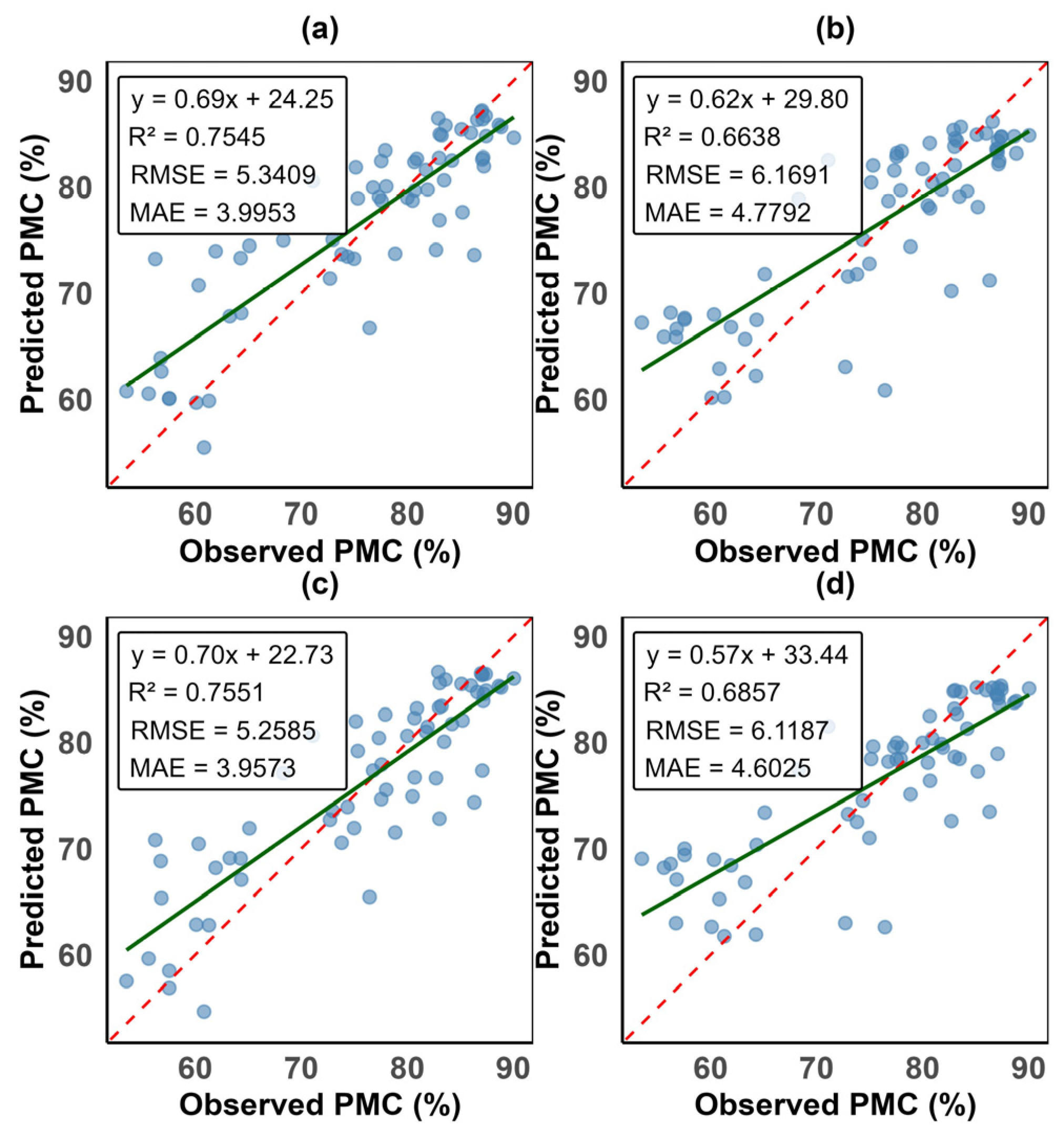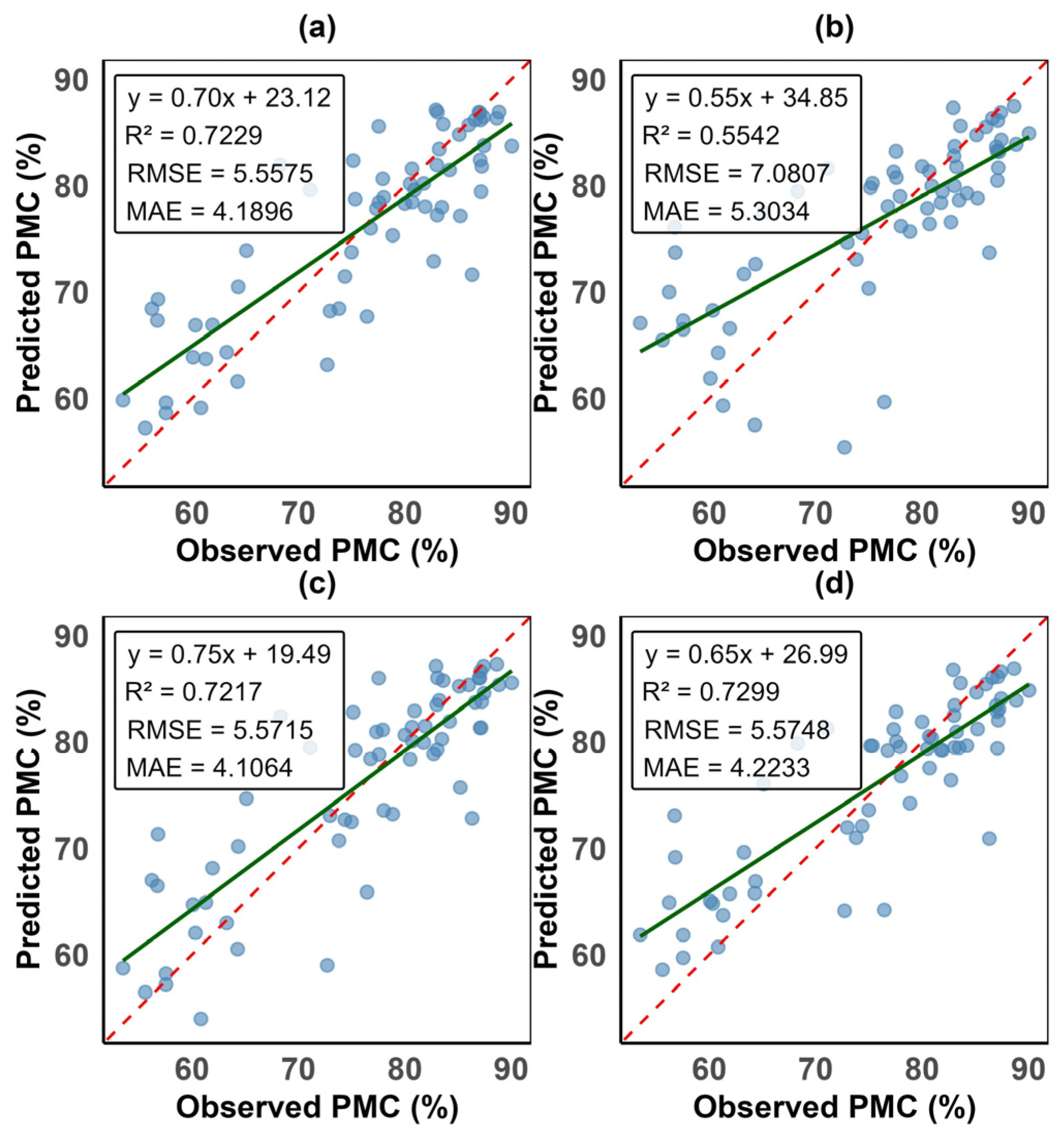 This figure shows the exponential water stress index (EWSI) validation performance model metrics. Sub-panels (a) is the random forest model, (b) is the partial least squares regression model, (c) is the support vector machine model, and (d) is the artificial neural networks model. The dashed red line is the 1:1 ratio line, while the green continuous line is the regression line. y is PMC, R2 is the coefficient of determination, RMSE is the root mean square error, and MAE is the mean absolute error. The nearer the dots are to the regression line, the higher the accuracy of the prediction.
