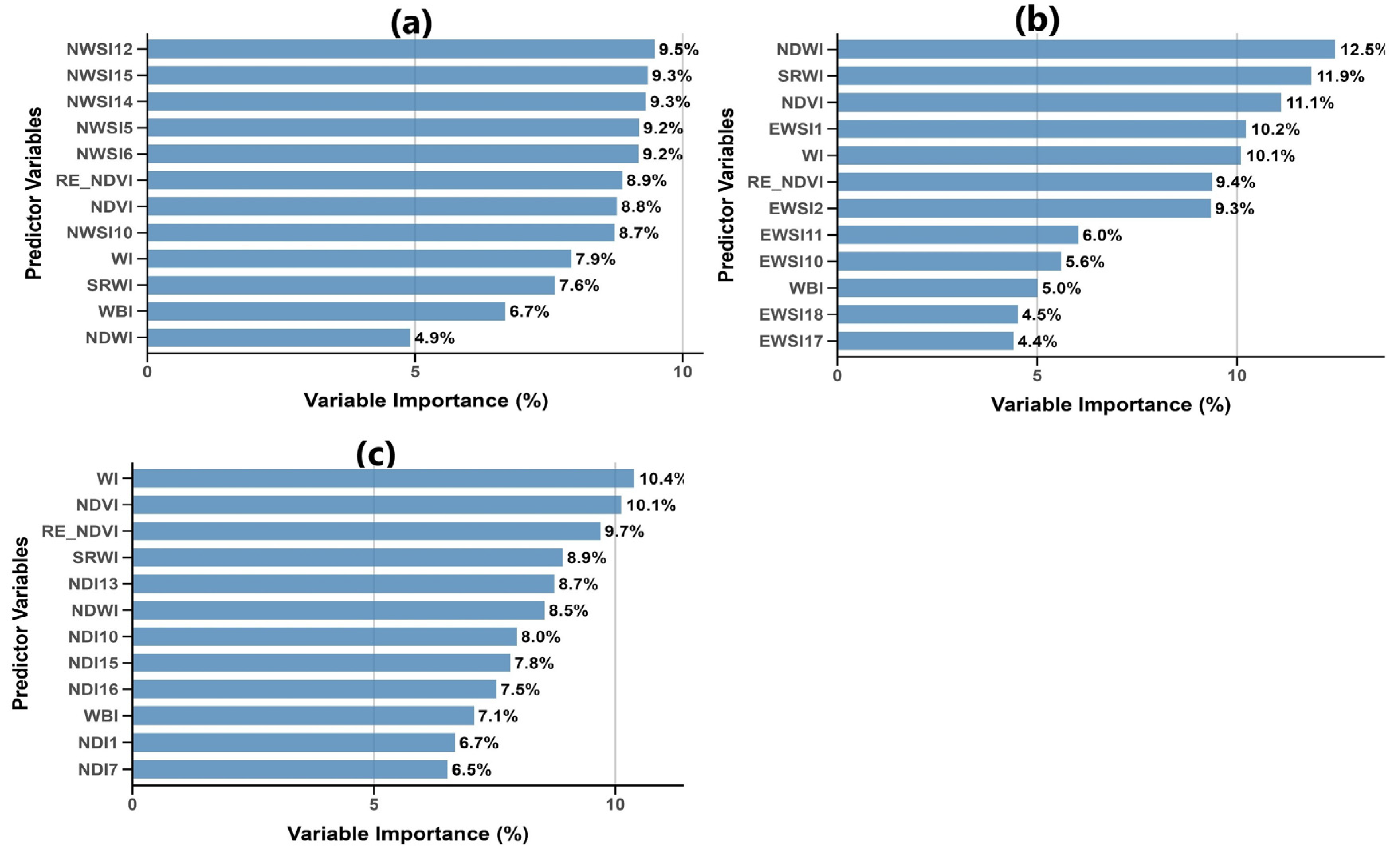 This figure presents the variable importance (%) from the RF model. (a) is the normalised water stress index (NWSI-Published indices) model, (b) is the exponential water stress index (EWSI-Published indices) model, and (c) is the normalised drought index (NDI-Published indices) model.