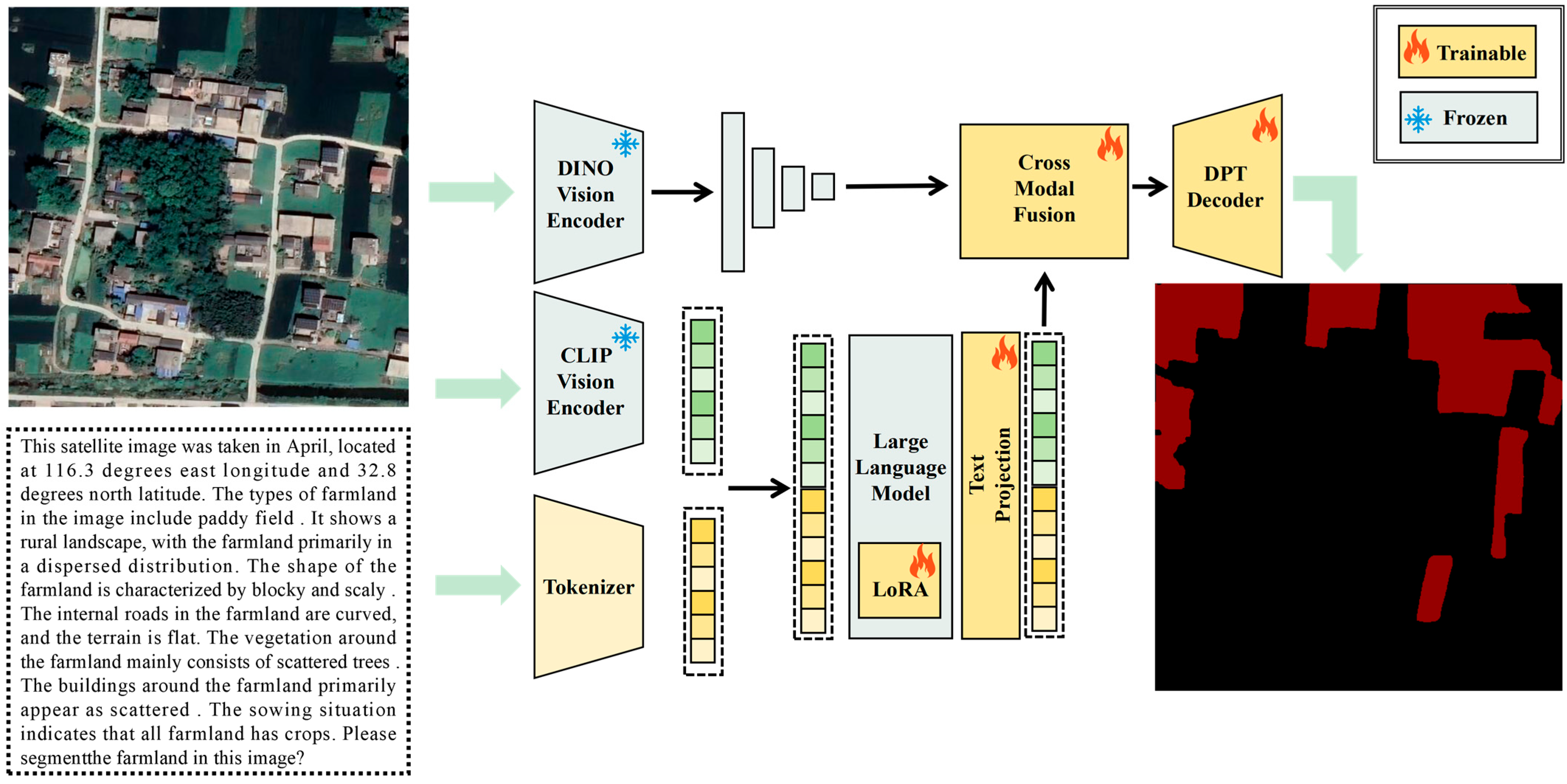 The results from the no-prompt variant provide important insights into the role of visual features when text information is unavailable. When the language model branch is completely removed, the model relies entirely on DINOv3 visual features for segmentation. The 87.46% mIoU achieved by this vision-only baseline demonstrates that DINOv3 provides a strong foundation for farmland recognition. However, the 2.20% improvement from adding detailed text prompts indicates that linguistic guidance enhances the model’s ability to disambiguate challenging cases. This behavior can be attributed to the UGAA module’s uncertainty estimation mechanism. When textual descriptions lack discriminative semantic information, the module estimates higher uncertainty scores and consequently reduces the fusion weight of text-guided features, allowing the model to rely more heavily on visual features from DINOv3. This adaptive behavior ensures stable segmentation performance even when text descriptions are ambiguous or uninformative.