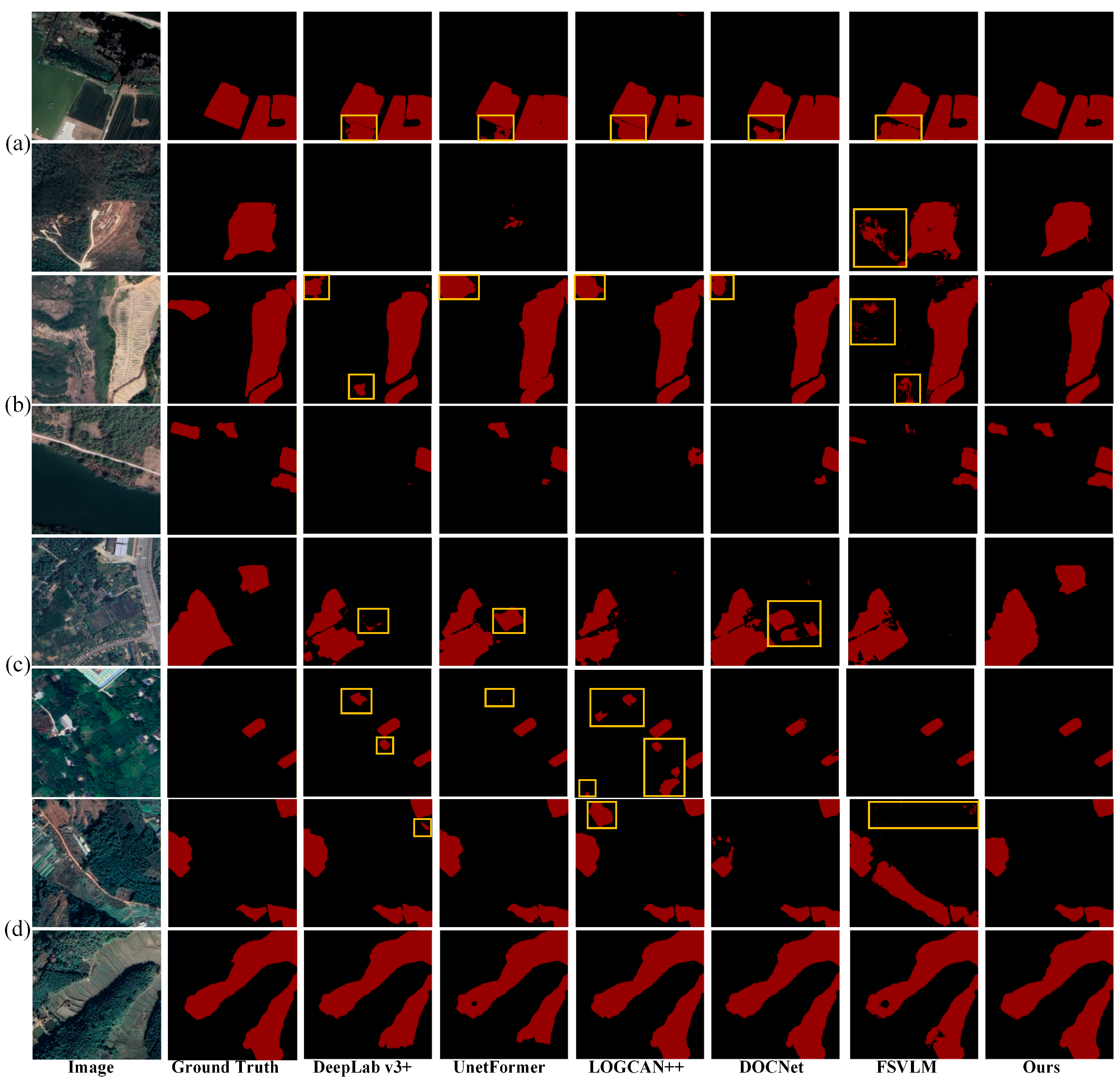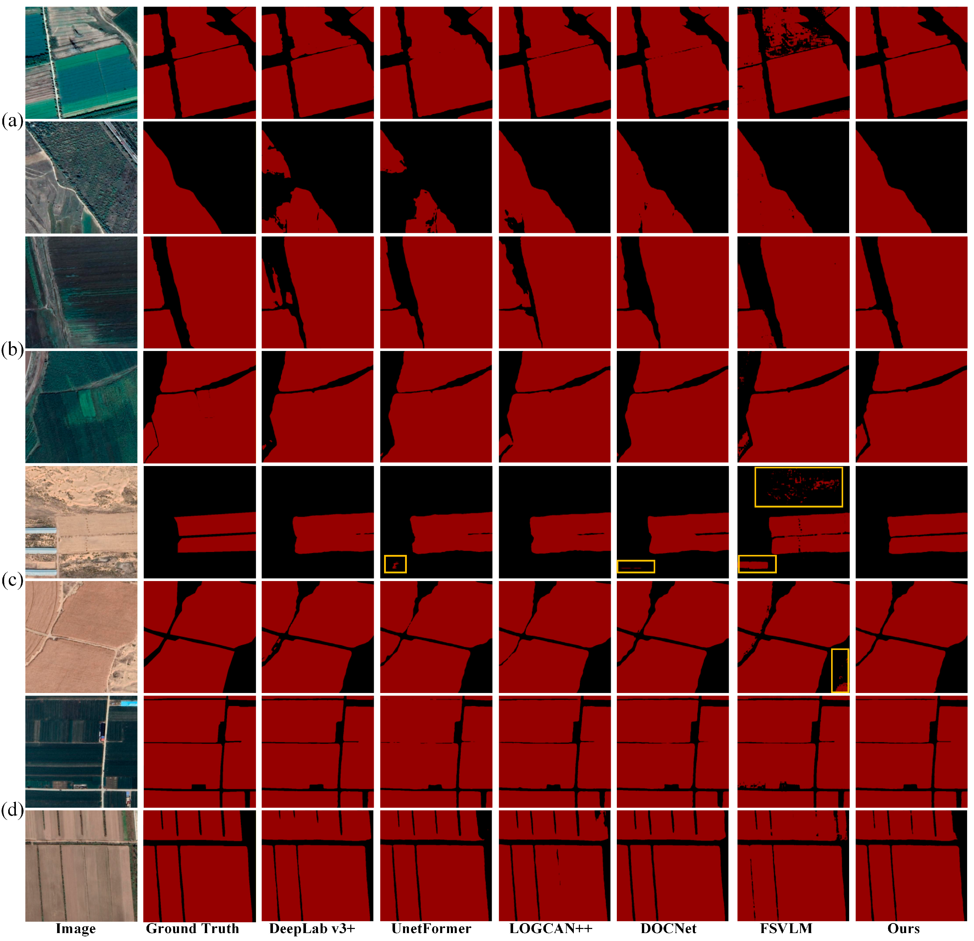 Figure 5). In the Northern Arid and Semi-arid Region samples (row a), our method achieves precise boundary delineation while maintaining clear separation between adjacent farmland parcels. In contrast, DeepLab-v3, UNetFormer, LOGCAN++, and DOCNet suffer from boundary adhesion where neighboring parcels are incorrectly merged, while FSVLM produces severe fragmentation artifacts. The Northeast China Plain samples (row b) demonstrate that our method not only accurately segments the boundaries of large-scale farmland parcels but also successfully extracts small farmland regions at the edges that other methods fail to detect. The Loess Plateau samples (row c) present particularly challenging scenarios where sparse vegetation and arid soil conditions cause farmland and non-farmland regions to exhibit similar visual characteristics. Other methods produce noticeable boundary adhesion or misalignment in areas with ambiguous land cover transitions, whereas our method successfully separates adjacent parcels with precise boundaries. The Huang-Huai-Hai Plain samples (row d) further confirm that our method achieves accurate boundary segmentation, while some competing methods incorrectly classify adjacent non-farmland areas as farmland. These qualitative observations corroborate the quantitative results, demonstrating that the proposed UGAA and FECF mechanisms effectively enhance both farmland recognition accuracy and boundary precision, particularly in preventing boundary adhesion between adjacent parcels and detecting small farmland regions across diverse geographical and agricultural conditions.