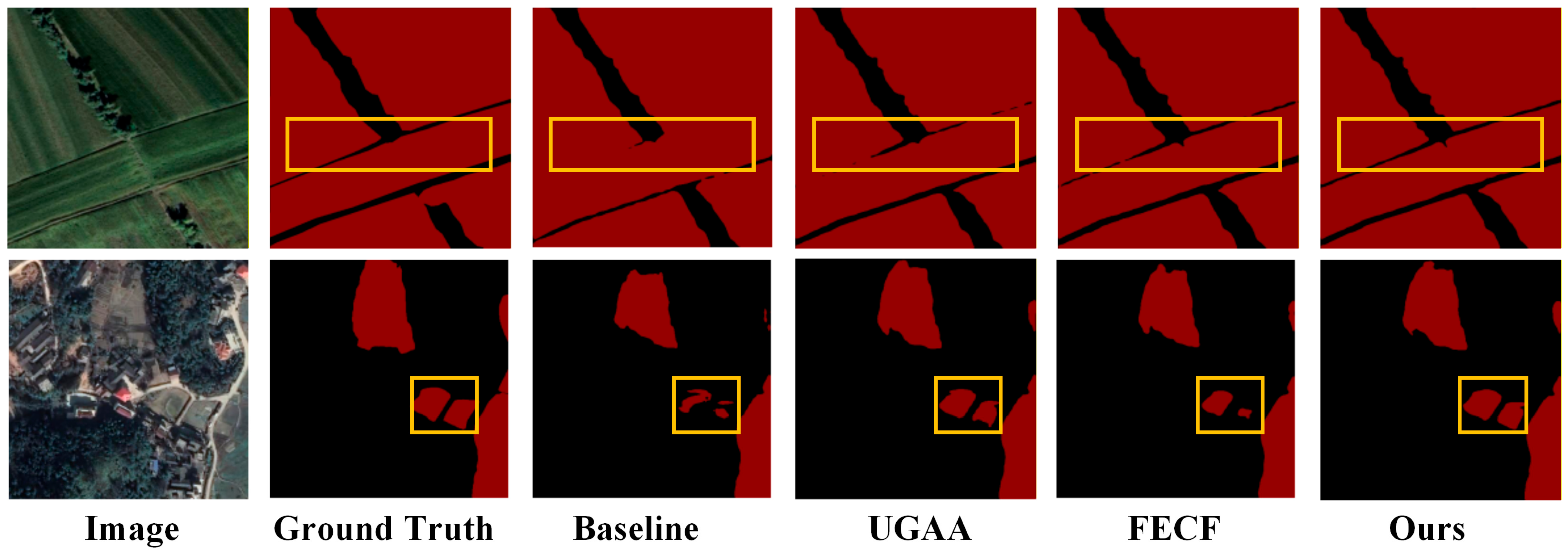 Figure 6. The first row demonstrates the effectiveness of our FECF module in boundary delineation. As highlighted by the yellow boxes, the baseline model and UGAA-only variant produce boundaries with noticeable irregularities and imprecise edges at field margins. In contrast, the configurations incorporating FECF (both FECF-only and the full model) achieve significantly sharper and more accurate boundary predictions. This improvement can be attributed to the frequency-domain decomposition in FECF, which explicitly preserves high-frequency boundary details that are often smoothed during conventional spatial-domain fusion operations. The narrow vegetation strips and subtle elevation changes along field edges are better captured through selective enhancement of boundary-relevant spectral components.