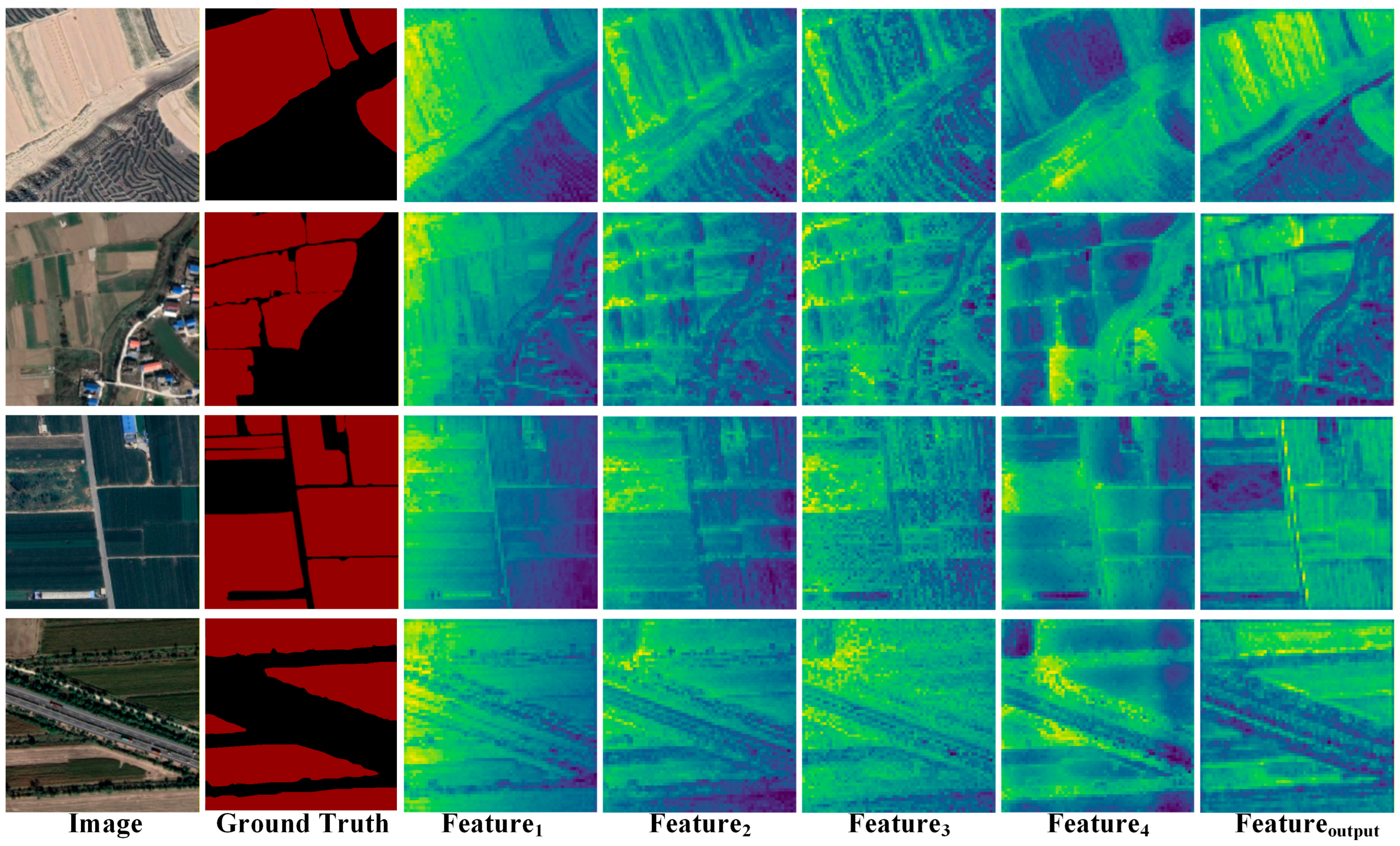 Figure 7. The columns three to six displays the four-dimensional feature maps output by the decoder before our cross-modal fusion modules, which serve as the foundation for dense prediction. These features capture multi-scale spatial information but exhibit limited discriminability at boundary regions and areas with similar visual appearances. The last column presents the enhanced feature maps after processing through both UGAA and FECF modules. The enhanced features demonstrate substantially improved boundary definition, with clearer separation between adjacent farmland parcels and more distinct activation patterns at field edges. Furthermore, the enhanced features show better consistency in homogeneous farmland regions while maintaining sharp transitions at boundaries, indicating that our dual-module design successfully addresses both semantic alignment challenges and geometric detail preservation. The comparison confirms that our proposed modules effectively transform the raw decoder features into more discriminative representations that are better suited for accurate farmland parcel segmentation.
