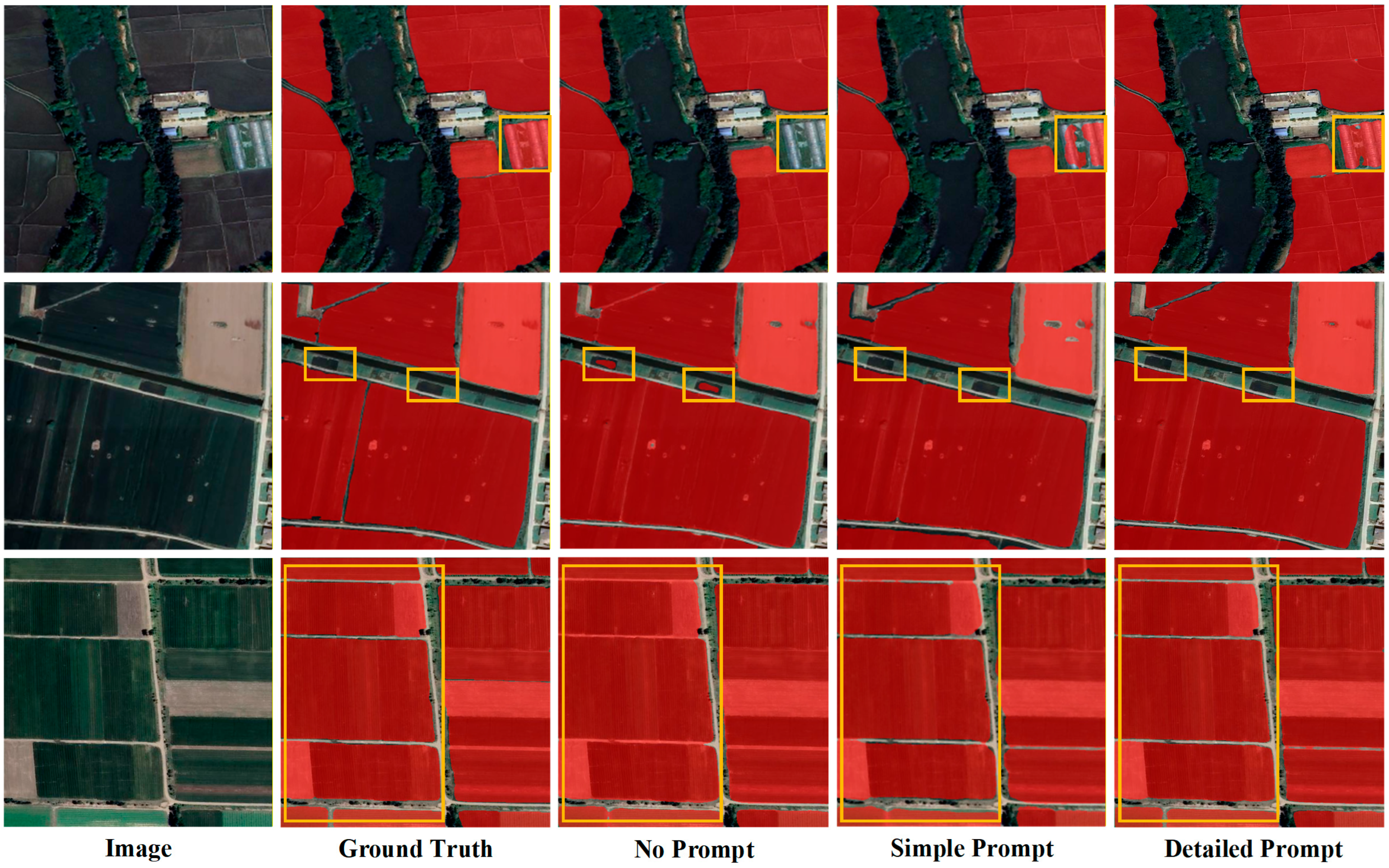Figure 8. Three representative cases illustrate the benefits of detailed prompts. In the first case, descriptions mentioning “farmland with greenhouses” enable correct identification of greenhouse-covered agricultural areas that simple prompts fail to recognize. In the second case, shape-related descriptions help distinguish farmland from visually similar non-agricultural regions, reducing false positive predictions. In the third case, descriptions specifying road conditions between farmlands produce clearer boundary delineation, avoiding the over-segmentation observed with simple prompts.