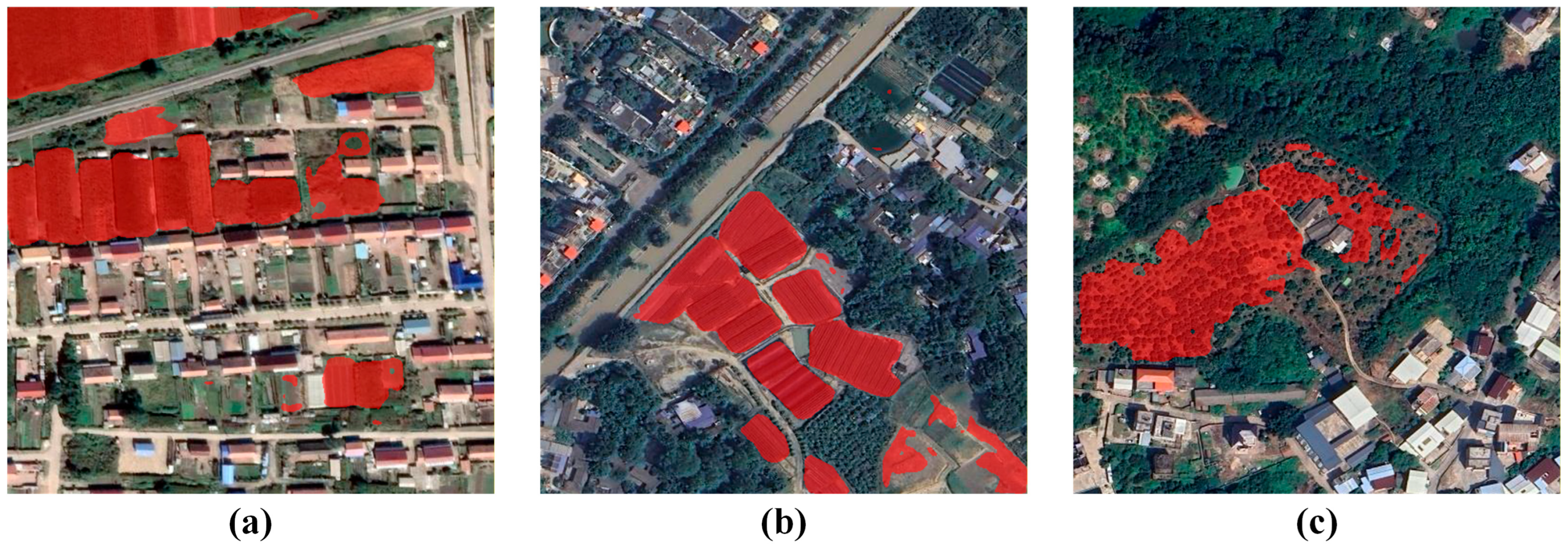 Figure 9a–c, these conditions lead to false positive predictions where non-agricultural green spaces are misclassified as farmland, boundary merging between adjacent micro-parcels, and irregular segmentation where farmland edges blend with surrounding vegetation.
